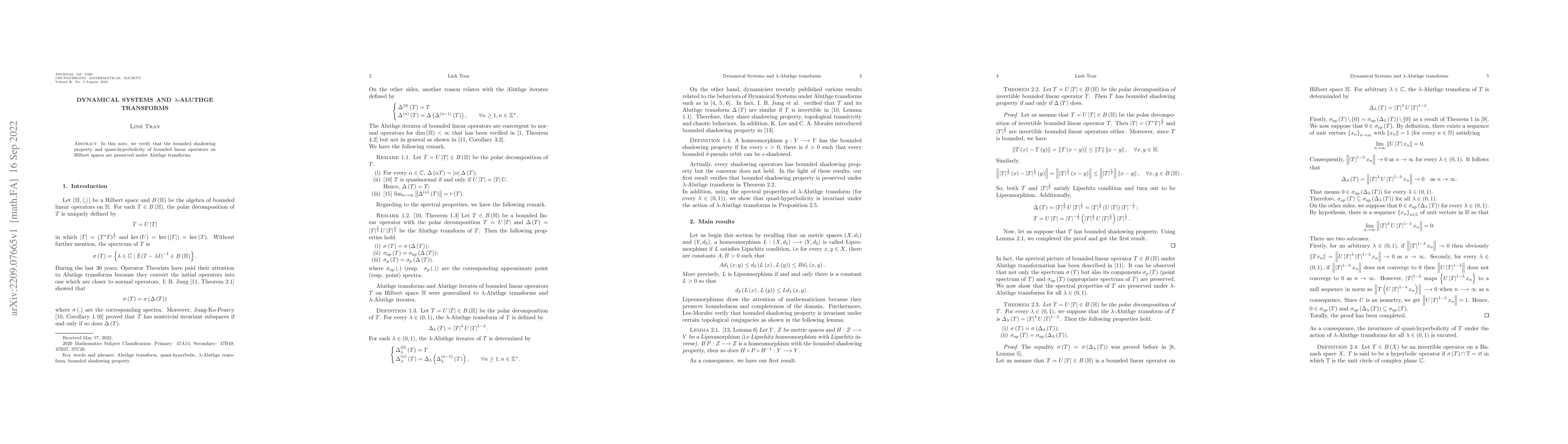 Summary: This paper confirms that the bounded shadowing property and quasi-hyperbolicity of linear operators on Hilbert spaces remain intact under Aluthge transforms. The study highlights the preservation of these dynamical system properties through specific operator transformations.