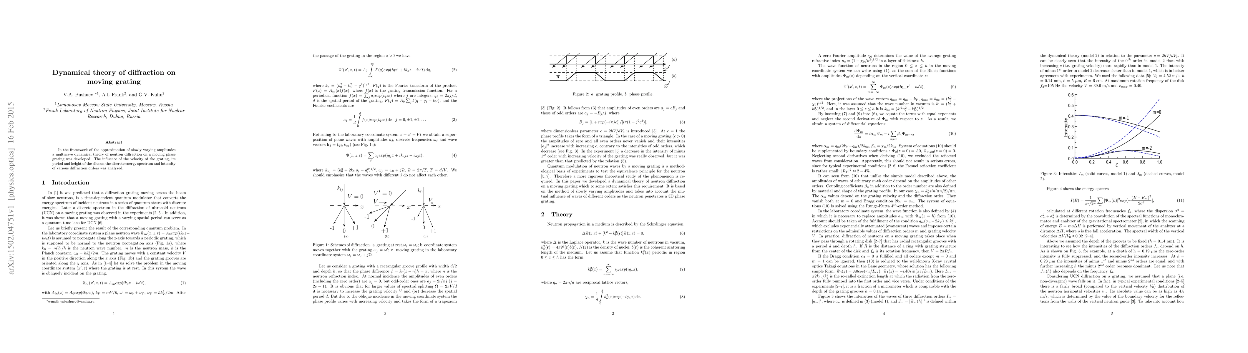 This paper develops a dynamical theory for neutron diffraction on a moving phase grating, analyzing how the grating's velocity, period, and slit height affect the energy spectrum and intensity of diffraction orders under slowly varying amplitude conditions.
