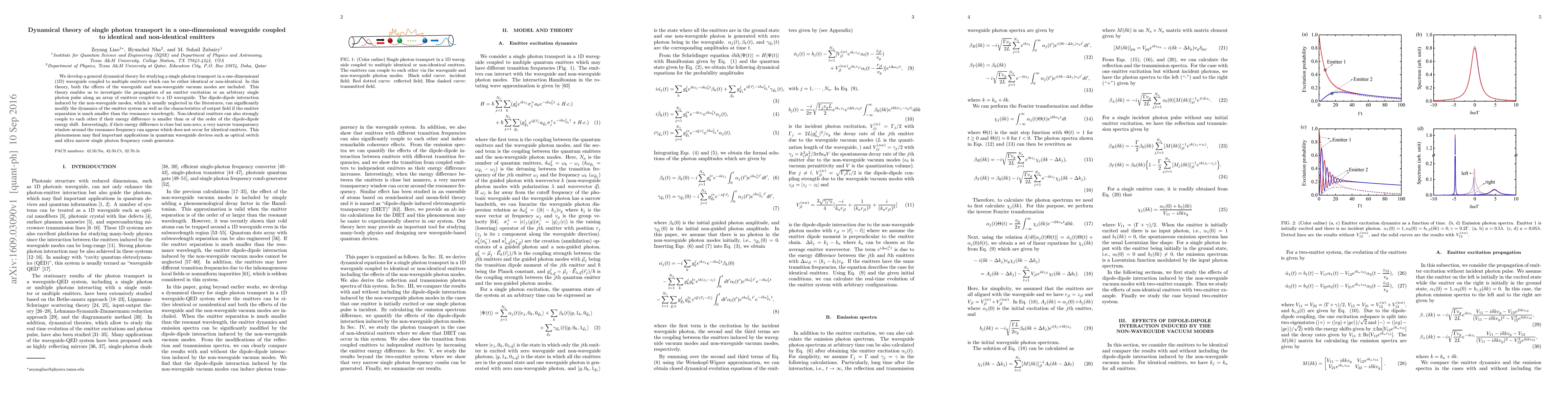 This paper presents a dynamical theory for single photon transport in a 1D waveguide coupled to identical and non-identical emitters, showing that dipole-dipole interactions affect the dynamics significantly when emitter separation is small. Non-identical emitters can exhibit unique transparency windows, potentially useful in quantum devices like optical switches and single photon frequency combs.