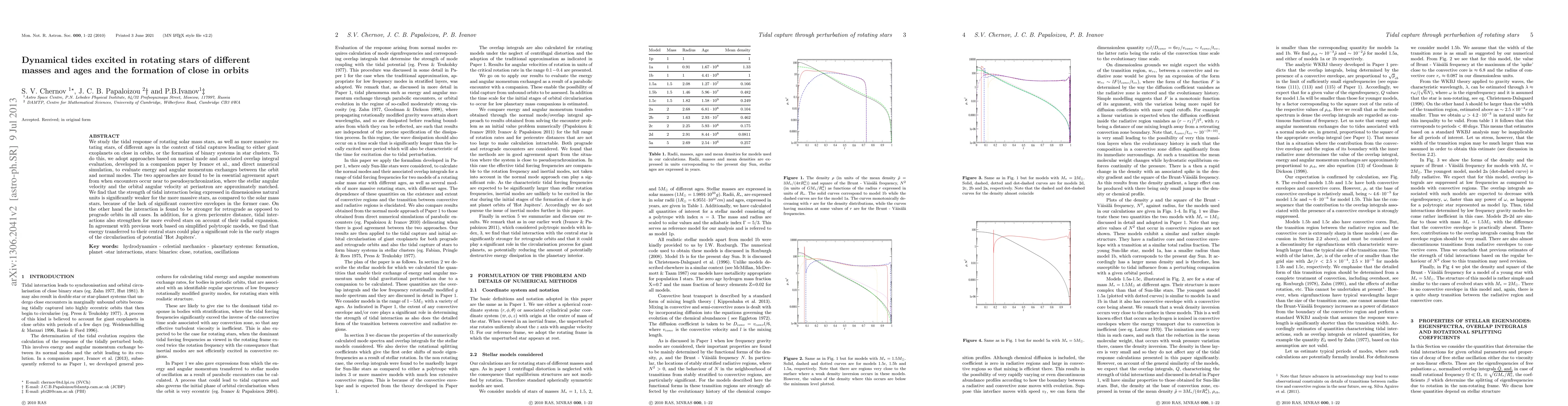 We study the tidal response of rotating solar mass stars, as well as more massive rotating stars, of different ages in the context of tidal captures leading to either giant exoplanets on close in orbits, or the formation of binary systems in star clusters. To do this, we adopt approaches based on normal mode and associated overlap integral evaluation, developed in a companion paper by Ivanov et al., and direct numerical simulation, to evaluate energy and angular momentum exchanges between the orbit and normal modes. The two approaches are found to be in essential agreement apart from when encounters occur near to pseudosynchronization, where the stellar angular velocity and the orbital angular velocity at periastron are approximately matched. We find that the strength of tidal interaction being expressed in dimensionless natural units is significantly weaker for the more massive stars, as compared to the solar mass stars, because of the lack of significant convective regions in the former case. On the other hand the interaction is found to be stronger for retrograde as opposed to prograde orbits in all cases. In addition, for a given pericentre distance, tidal interactions also strengthen for more evolved stars on account of their radial expansion. In agreement with previous work based on simplified polytropic models, we find that energy transferred to their central stars could play a significant role in the early stages of the circularisation of potential 'Hot Jupiters'.