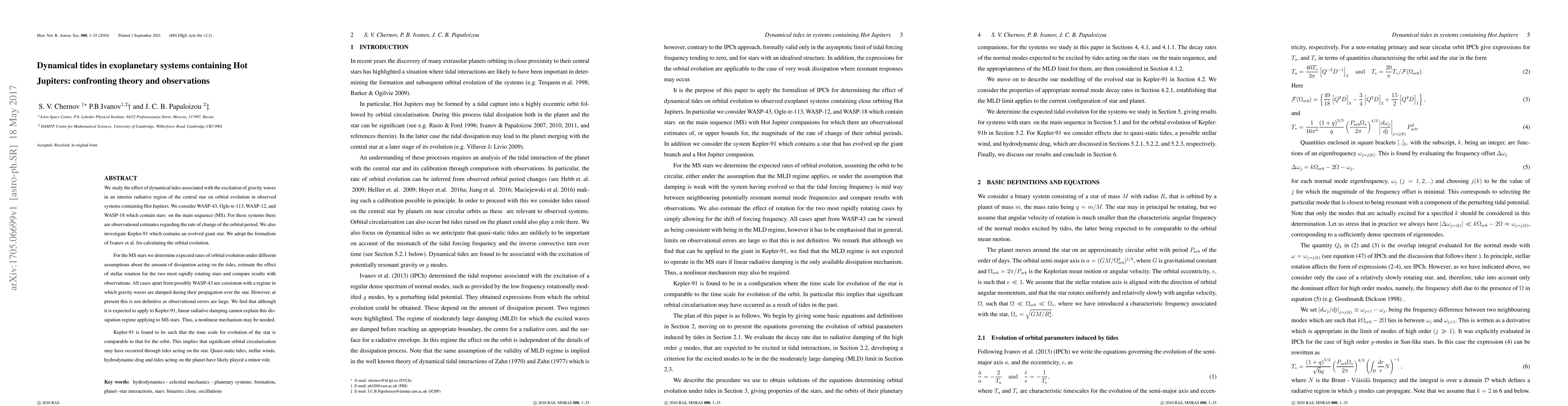 We study the effect of dynamical tides associated with the excitation of gravity waves in an interior radiative region of the central star on orbital evolution in observed systems containing Hot Jupiters. We consider WASP-43, Ogle-tr-113, WASP-12, and WASP-18 which contain stars on the main sequence (MS). For these systems there are observational estimates regarding the rate of change of the orbital period. We also investigate Kepler-91 which contains an evolved giant star. We adopt the formalism of Ivanov et al. for calculating the orbital evolution. For the MS stars we determine expected rates of orbital evolution under different assumptions about the amount of dissipation acting on the tides, estimate the effect of stellar rotation for the two most rapidly rotating stars and compare results with observations. All cases apart from possibly WASP-43 are consistent with a regime in which gravity waves are damped during their propagation over the star. However, at present this is not definitive as observational errors are large. We find that although it is expected to apply to Kepler-91, linear radiative damping cannot explain this dis- sipation regime applying to MS stars. Thus, a nonlinear mechanism may be needed. Kepler-91 is found to be such that the time scale for evolution of the star is comparable to that for the orbit. This implies that significant orbital circularisation may have occurred through tides acting on the star. Quasi-static tides, stellar winds, hydrodynamic drag and tides acting on the planet have likely played a minor role.