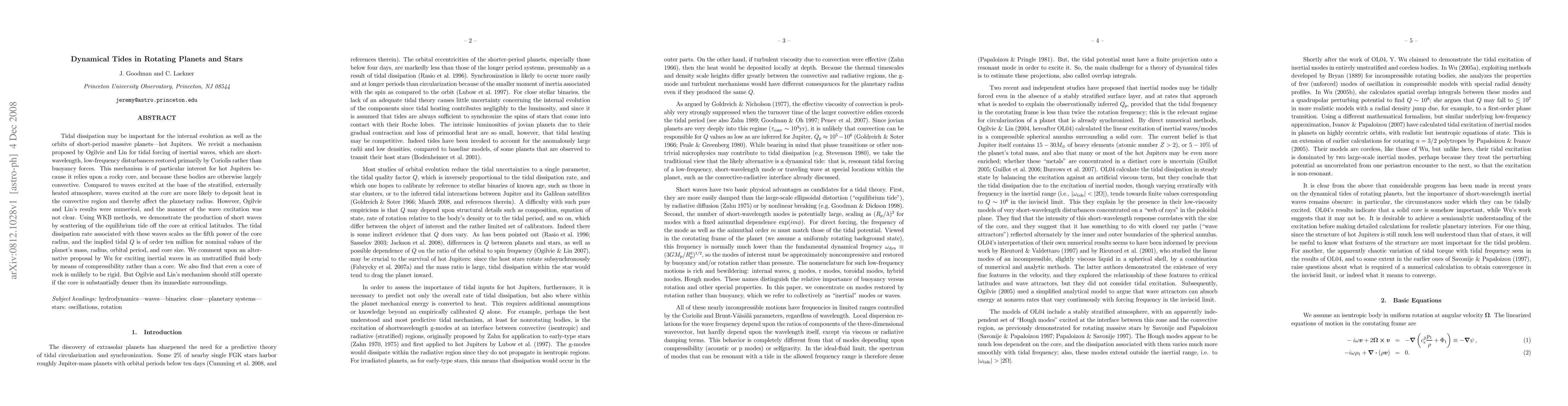 Tidal dissipation may be important for the internal evolution as well as the orbits of short-period massive planets--hot Jupiters. We revisit a mechanism proposed by Ogilvie and Lin for tidal forcing of inertial waves, which are short-wavelength, low-frequency disturbances restored primarily by Coriolis rather than buoyancy forces. This mechanism is of particular interest for hot Jupiters because it relies upon a rocky core, and because these bodies are otherwise largely convective. Compared to waves excited at the base of the stratified, externally heated atmosphere, waves excited at the core are more likely to deposit heat in the convective region and thereby affect the planetary radius. However, Ogilvie and Lin's results were numerical, and the manner of the wave excitation was not clear. Using WKB methods, we demonstrate the production of short waves by scattering of the equilibrium tide off the core at critical latitudes. The tidal dissipation rate associated with these waves scales as the fifth power of the core radius, and the implied tidal $Q$ is of order ten million for nominal values of the planet's mass, radius, orbital period, and core size. We comment upon an alternative proposal by Wu for exciting inertial waves in an unstratified fluid body by means of compressibility rather than a core. We also find that even a core of rock is unlikely to be rigid. But Ogilvie and Lin's mechanism should still operate if the core is substantially denser than its immediate surroundings.
