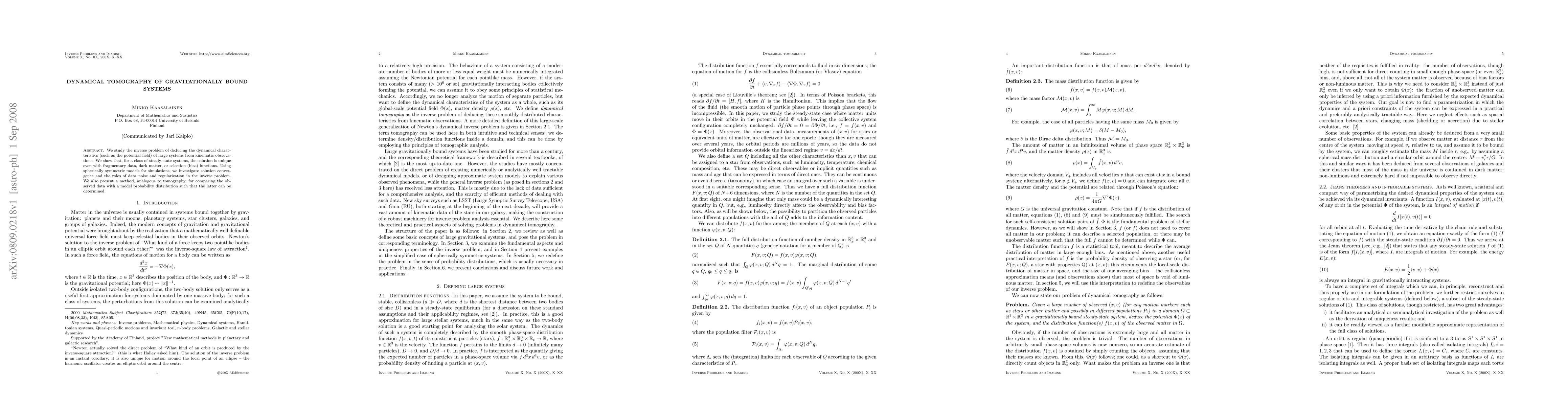 We study the inverse problem of deducing the dynamical characteristics (such as the potential field) of large systems from kinematic observations. We show that, for a class of steady-state systems, the solution is unique even with fragmentary data, dark matter, or selection (bias) functions. Using spherically symmetric models for simulations, we investigate solution convergence and the roles of data noise and regularization in the inverse problem. We also present a method, analogous to tomography, for comparing the observed data with a model probability distribution such that the latter can be determined.