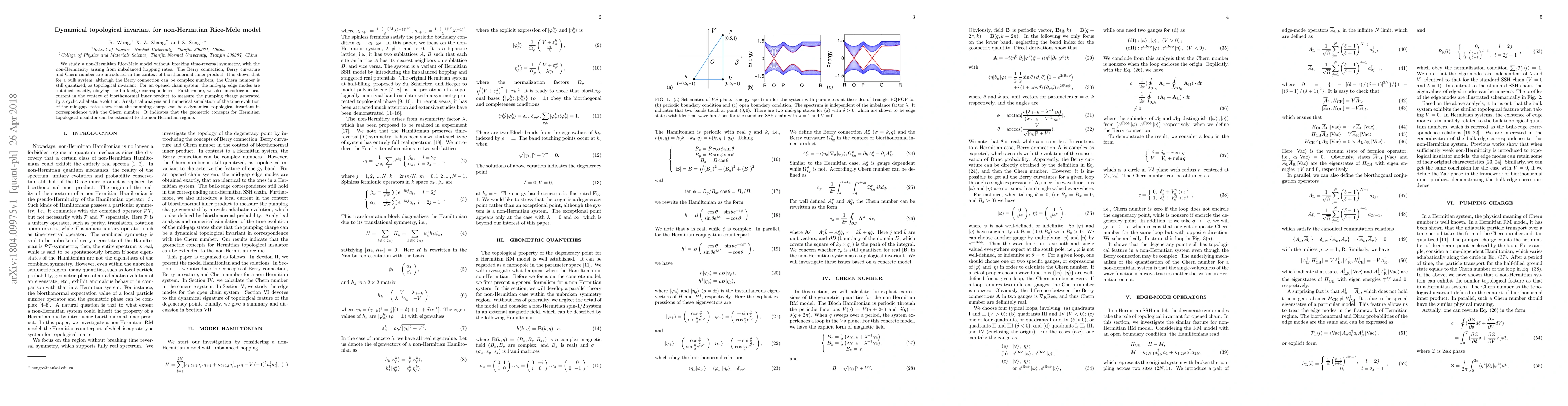 This paper investigates the non-Hermitian Rice-Mele model, demonstrating that the Chern number remains quantized as a topological invariant despite complex Berry connections. It also introduces a local current to measure pumping charge, showing that this charge can serve as a dynamical topological invariant, extending geometric concepts from Hermitian to non-Hermitian systems.