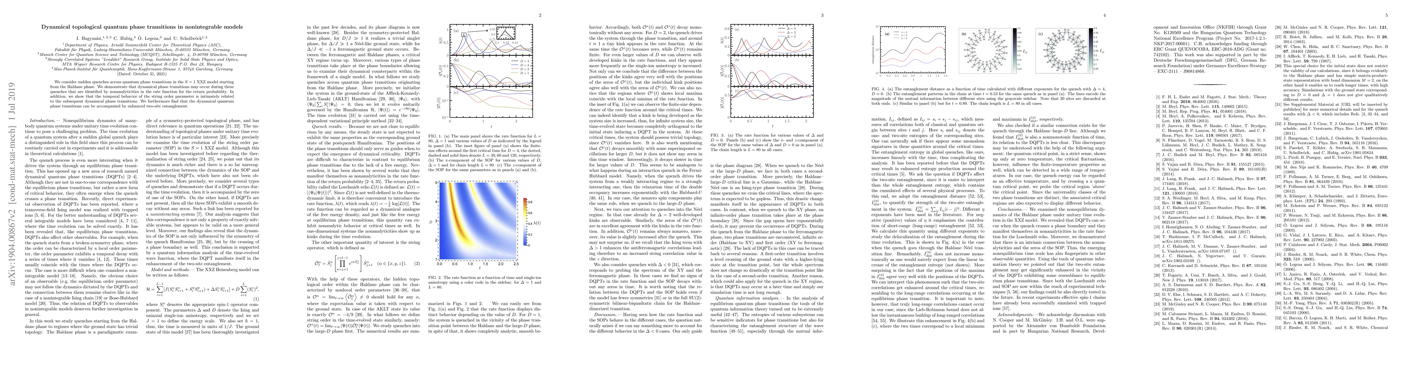 We consider sudden quenches across quantum phase transitions in the $S=1$ XXZ model starting from the Haldane phase. We demonstrate that dynamical phase transitions may occur during these quenches that are identified by nonanalyticities in the rate function for the return probability. In addition, we show that the temporal behavior of the string order parameter is intimately related to the subsequent dynamical phase transitions. We furthermore find that the dynamical quantum phase transitions can be accompanied by enhanced two-site entanglement.