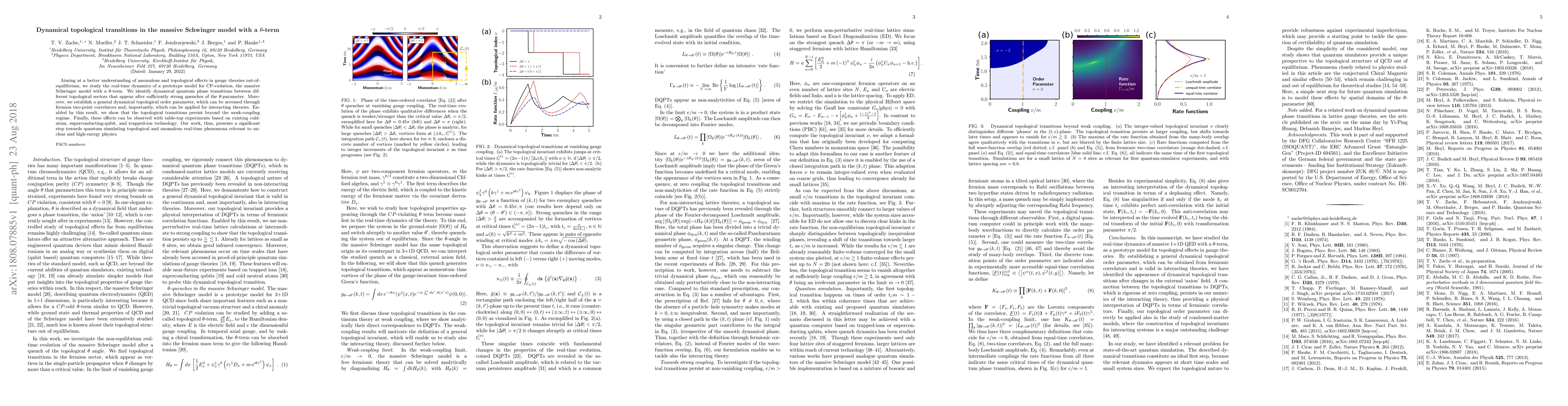 This paper investigates dynamical topological transitions in the massive Schwinger model with a $\theta$-term, identifying quantum phase transitions triggered by strong $\theta$-parameter quenches. It introduces a general dynamical topological order parameter applicable to interacting theories, demonstrating persistent topological transitions beyond weak-coupling regimes, and suggesting potential observation via table-top experiments using cold-atom, superconducting-qubit, and trapped-ion technologies.