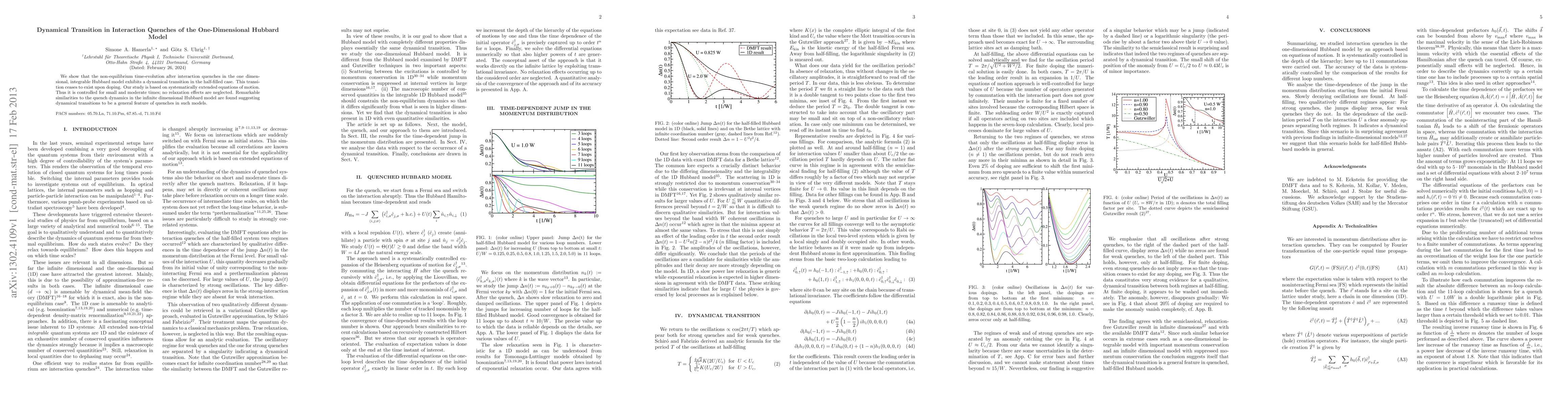 The paper demonstrates that the one-dimensional integrable Hubbard model undergoes a dynamical transition in its non-equilibrium time-evolution following interaction quenches, specifically in the half-filled case, which vanishes upon doping. The findings suggest that dynamical transitions may be a general feature in quench dynamics of similar models.