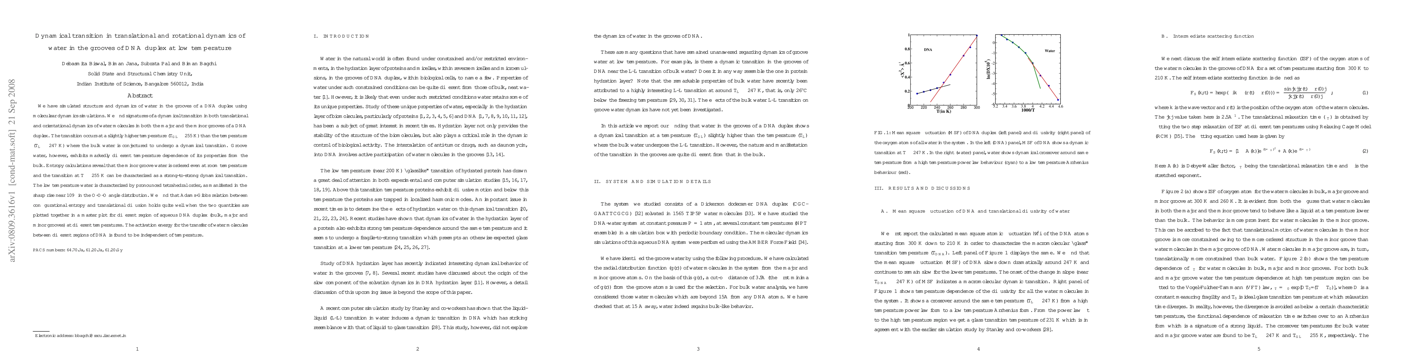 We have simulated structure and dynamics of water in the grooves of a DNA duplex using moleculear dynamics simulations. We find signatures of a dynamical transition in both translational and orientational dynamics of water molecules in both the major and the minor grooves of a DNA duplex. The transition occurs at a slightly higher temperature ($T_{GL} \approx $ 255 K) than the temperature ($T_L\approx$ 247 K) where the bulk water is conjectured to undergo a dynamical transition. Groove water, however, exhibits markedly different temperature dependence of its properties from the bulk. Entropy calculations reveal that the minor groove water is ordered even at room temperature and the transition at $T \approx$ 255 K can be characterized as a {\em strong-to-strong} dynamical transition. The low temperature water is characterized by pronounced tetrahedral order, as manifested in the sharp rise near $109^{\circ}$ in the O-O-O angle distribution. We find that Adams-Gibbs relation between configurational entropy and translational diffusion holds quite well when the two quantities are plotted together in a master plot for different region of aqueous DNA duplex (bulk, major and minor grooves) at different temperatures. The activation energy for the transfer of water molecules between different regions of DNA is found to be independent of temperature.