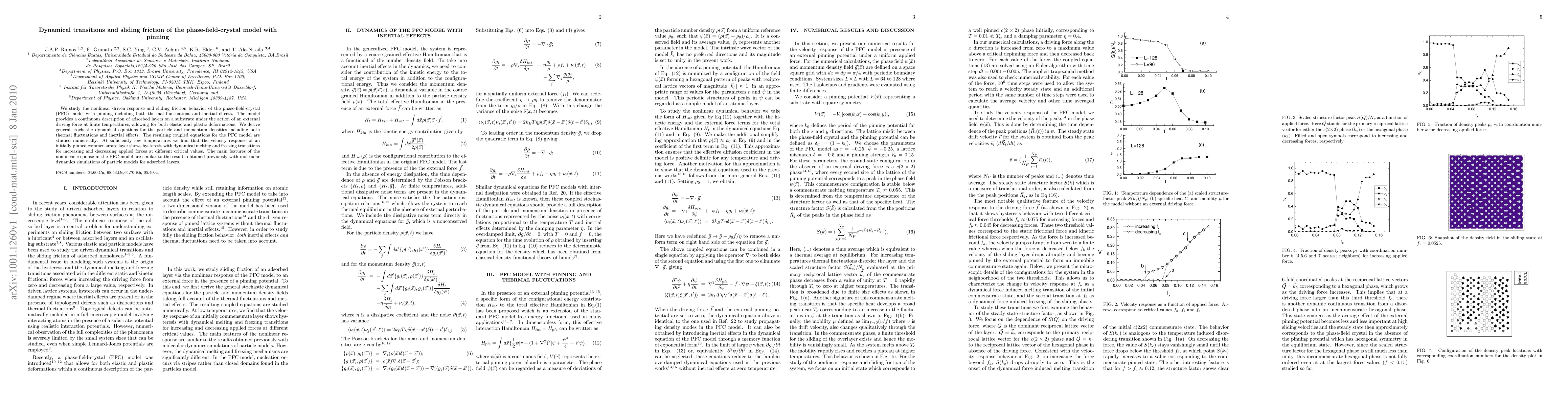 This paper investigates the sliding friction and dynamical transitions in the phase-field-crystal (PFC) model with pinning, incorporating thermal fluctuations and inertial effects. The study reveals hysteresis, dynamical melting, and freezing transitions in the velocity response of pinned layers under varying applied forces, mirroring findings from molecular dynamics simulations.