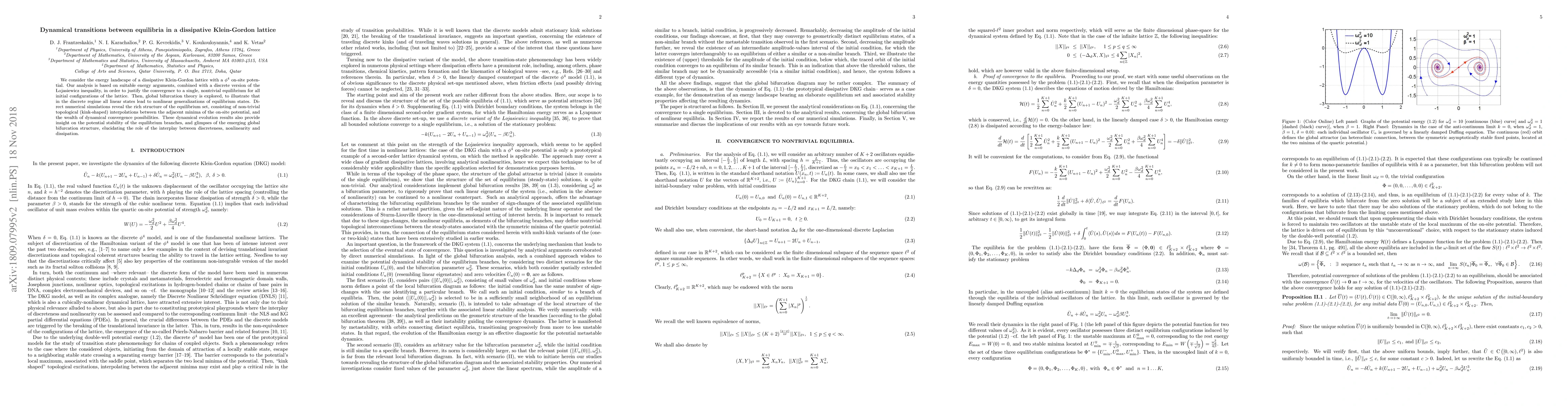 We consider the energy landscape of a dissipative Klein-Gordon lattice with a $\phi^4$ on-site potential. Our analysis is based on suitable energy arguments, combined with a discrete version of the \L{}ojasiewicz inequality, in order to justify the convergence to a single, nontrivial equilibrium for all initial configurations of the lattice. Then, global bifurcation theory is explored, to illustrate that in the discrete regime all linear states lead to nonlinear generalizations of equilibrium states. Direct numerical simulations reveal the rich structure of the equilibrium set, consisting of non-trivial topological (kink-shaped) interpolations between the adjacent minima of the on-site potential, and the wealth of dynamical convergence possibilities. These dynamical evolution results also provide insight on the potential stability of the equilibrium branches, and glimpses of the emerging global bifurcation structure, elucidating the role of the interplay between discreteness, nonlinearity and dissipation.