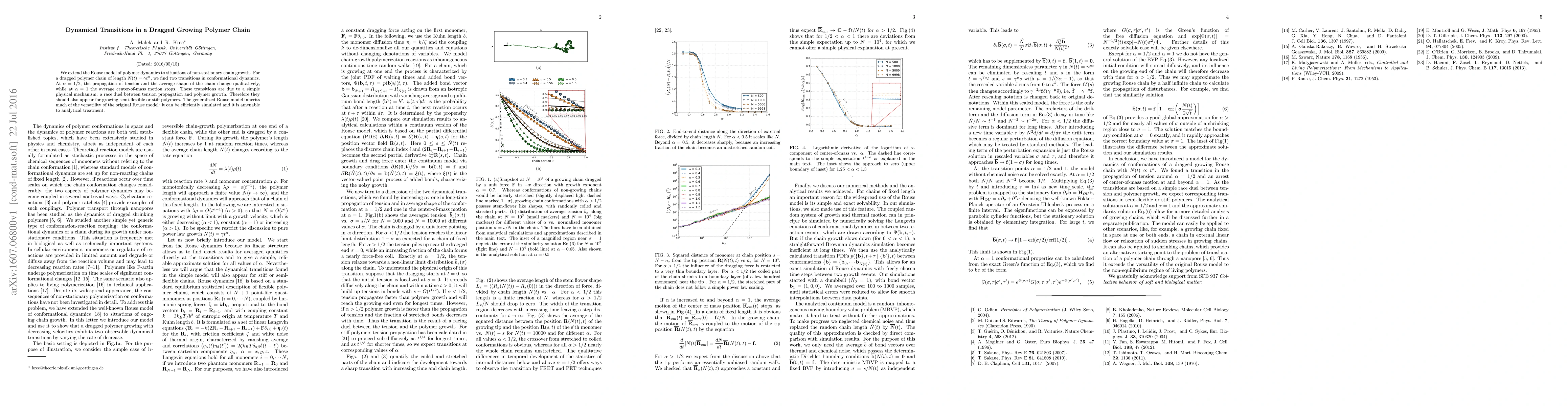 Researchers extended the Rouse model to study dynamic transitions in a growing polymer chain under dragging conditions. They found two critical transitions at different growth rates, which affect the chain's conformational dynamics.