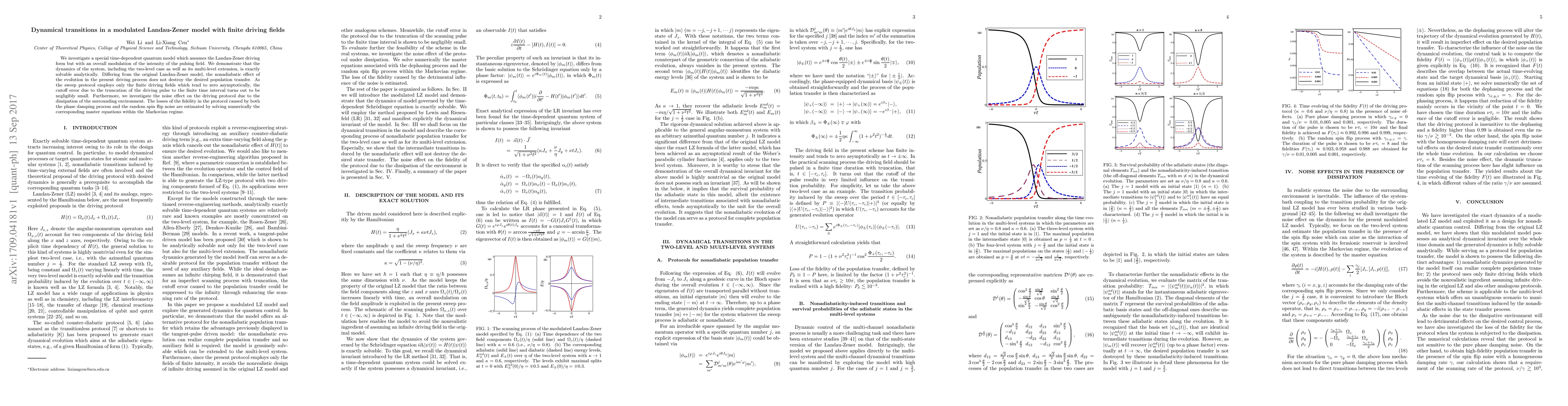 We investigate a special time-dependent quantum model which assumes the Landau-Zener driving form but with an overall modulation of the intensity of the pulsing field. We demonstrate that the dynamics of the system, including the two-level case as well as its multi-level extension, is exactly solvable analytically. Differing from the original Landau-Zener model, the nonadiabatic effect of the evolution in the present driving process does not destroy the desired population transfer. As the sweep protocol employs only the finite driving fields which tend to zero asymptotically, the cutoff error due to the truncation of the driving pulse to the finite time interval turns out to be negligibly small. Furthermore, we investigate the noise effect on the driving protocol due to the dissipation of the surrounding environment. The losses of the fidelity in the protocol caused by both the phase damping process and the random spin flip noise are estimated by solving numerically the corresponding master equations within the Markovian regime.