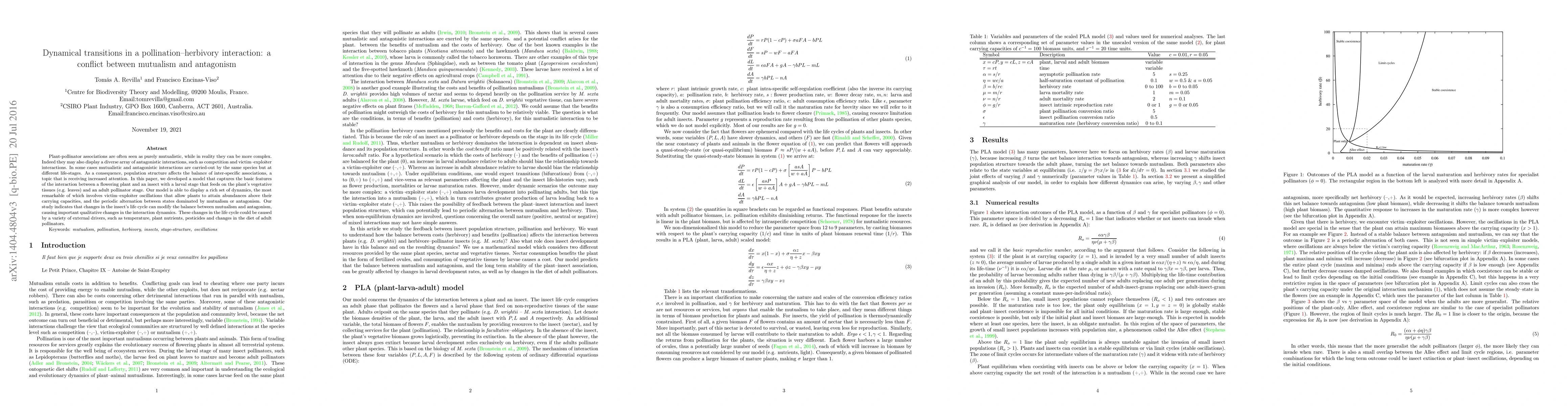 Plant-pollinator associations are often seen as purely mutualistic, while in reality they can be more complex. Indeed they may also display a diverse array of antagonistic interactions, such as competition and victim--exploiter interactions. In some cases mutualistic and antagonistic interactions are carried-out by the same species but at different life-stages. As a consequence, population structure affects the balance of inter-specific associations, a topic that is receiving increased attention. In this paper, we developed a model that captures the basic features of the interaction between a flowering plant and an insect with a larval stage that feeds on the plant's vegetative tissues (e.g. leaves) and an adult pollinator stage. Our model is able to display a rich set of dynamics, the most remarkable of which involves victim--exploiter oscillations that allow plants to attain abundances above their carrying capacities, and the periodic alternation between states dominated by mutualism or antagonism. Our study indicates that changes in the insect's life cycle can modify the balance between mutualism and antagonism, causing important qualitative changes in the interaction dynamics. These changes in the life cycle could be caused by a variety of external drivers, such as temperature, plant nutrients, pesticides and changes in the diet of adult pollinators. Abstract Keywords: mutualism, pollination, herbivory, insects, stage-structure, oscillations