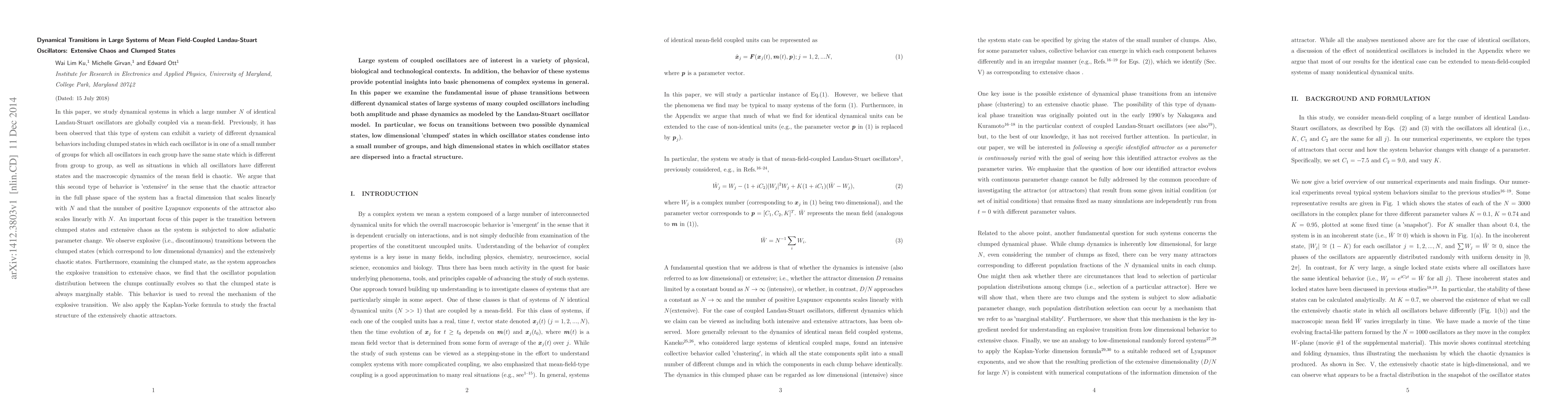 Researchers studied large systems of coupled Landau-Stuart oscillators, finding explosive transitions between stable clumped states and extensively chaotic behavior as a parameter is slowly changed, with the latter exhibiting fractal dimensions scaling linearly with system size.