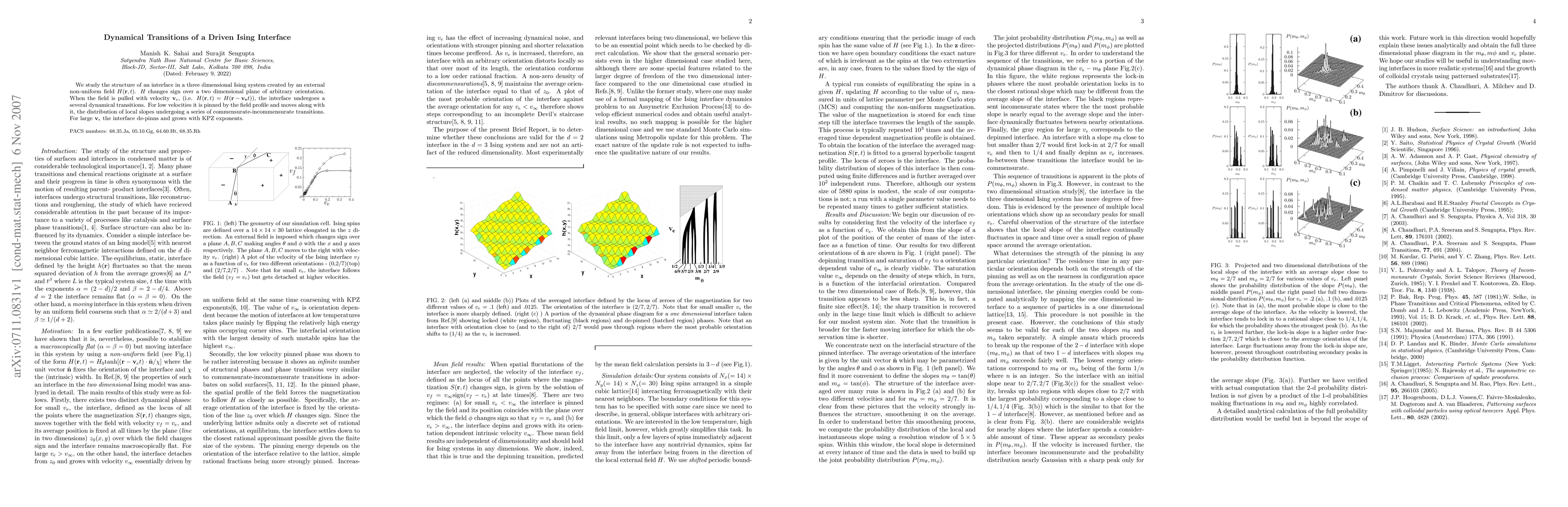 We study the structure of an interface in a three dimensional Ising system created by an external non-uniform field $H({\bf r},t)$. $H$ changes sign over a two dimensional plane of arbitrary orientation. When the field is pulled with velocity ${\bf v}_e$, (i.e. $H({\bf r},t) = H({\bf r - v_e}t)$), the interface undergoes a several dynamical transitions. For low velocities it is pinned by the field profile and moves along with it, the distribution of local slopes undergoing a series of commensurate-incommensurate transitions. For large ${\bf v}_e$ the interface de-pinns and grows with KPZ exponents.