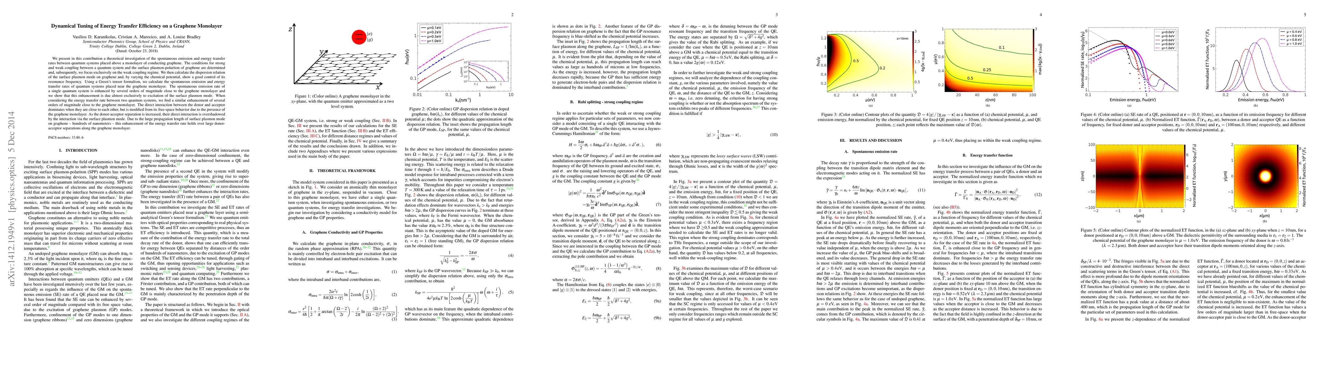 We present in this contribution a theoretical investigation of the spontaneous emission and energy transfer rates between quantum systems placed above a monolayer of conducting graphene. The conditions for strong and weak coupling between a quantum system and the surface plasmon-polariton of graphene are determined and, subsequently, we focus exclusively on the weak coupling regime. We then calculate the dispersion relation of the surface plasmon mode on graphene and, by varying the chemical potential, show a good control of its resonance frequency. Using a Green's tensor formalism, we calculate the spontaneous emission and energy transfer rates of quantum systems placed near the graphene monolayer. The spontaneous emission rate of a single quantum system is enhanced by several orders of magnitude close to the graphene monolayer and we show that this enhancement is due almost exclusively to excitation of the surface plasmon mode. When considering the energy transfer rate between two quantum systems, we find a similar enhancement of several orders of magnitude close to the graphene monolayer. The direct interaction between the donor and acceptor dominates when they are close to each other, but is modified from its free-space behavior due to the presence of the graphene monolayer. As the donor-acceptor separation is increased, their direct interaction is overshadowed by the interaction via the surface plasmon mode. Due to the large propagation length of surface plasmon mode on graphene -- hundreds of nanometers -- this enhancement of the energy transfer rate holds over large donor-acceptor separations along the graphene monolayer.