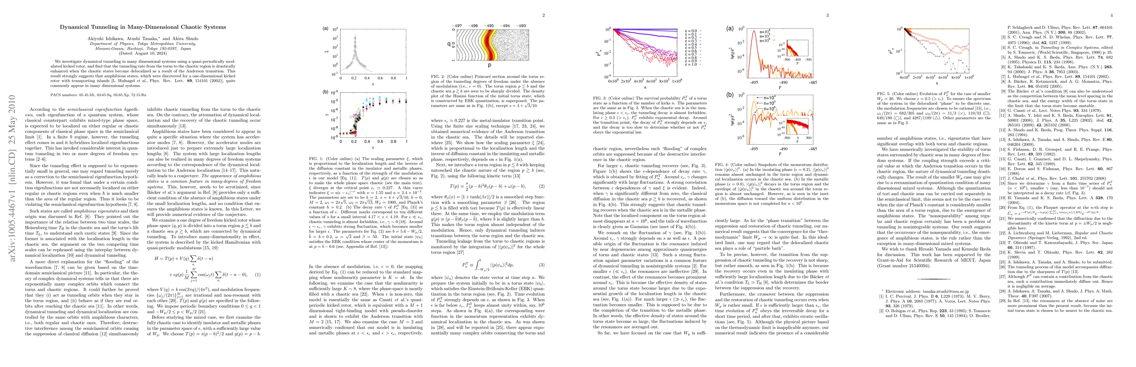The paper presents a detailed numerical analysis of dynamical tunneling in many-dimensional chaotic systems, introducing the concept of amphibious states and their relation to the Anderson transition.