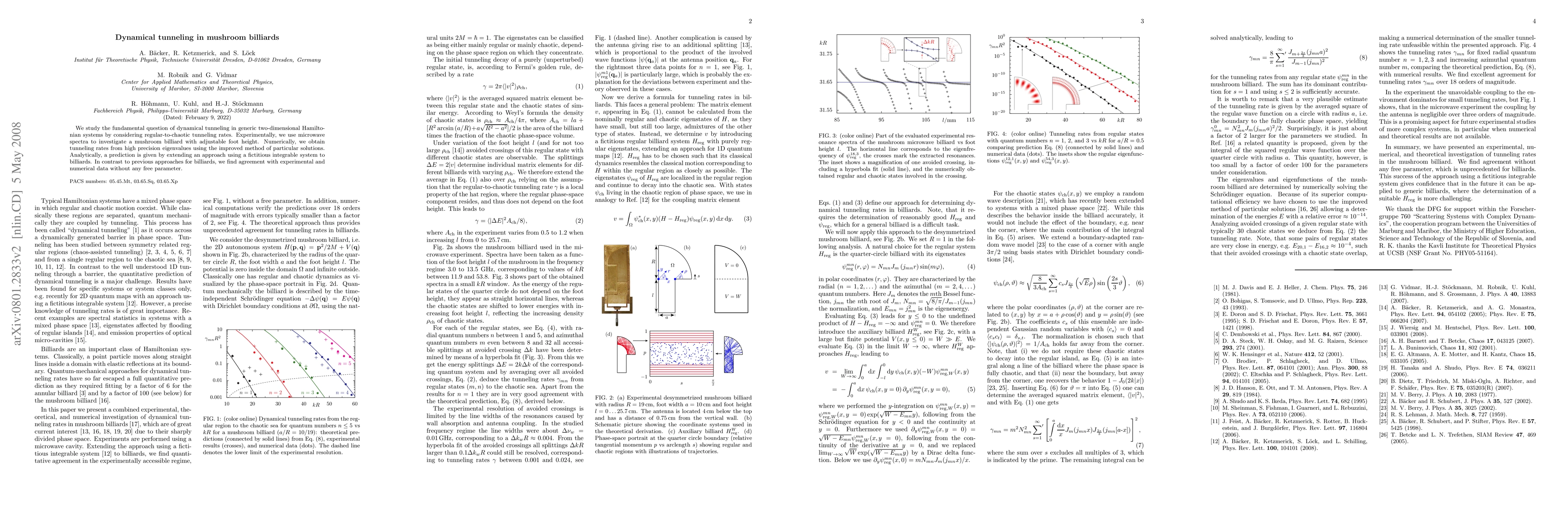 This paper investigates dynamical tunneling in two-dimensional Hamiltonian systems, focusing on regular-to-chaotic tunneling rates in mushroom billiards. It combines experimental microwave spectra, high-precision numerical methods, and analytical predictions to demonstrate the absence of free parameters in matching theoretical models to data.