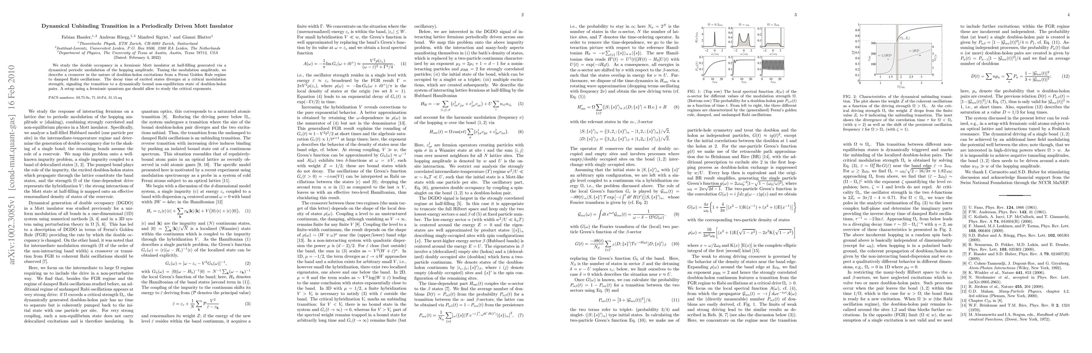 We study the double occupancy in a fermionic Mott insulator at half-filling generated via a dynamical periodic modulation of the hopping amplitude. Tuning the modulation amplitude, we describe a crossover in the nature of doublon-holon excitations from a Fermi Golden Rule regime to damped Rabi oscillations. The decay time of excited states diverges at a critical modulation strength, signaling the transition to a dynamically bound non-equilibrium state of doublon-holon pairs. A setup using a fermionic quantum gas should allow to study the critical exponents.