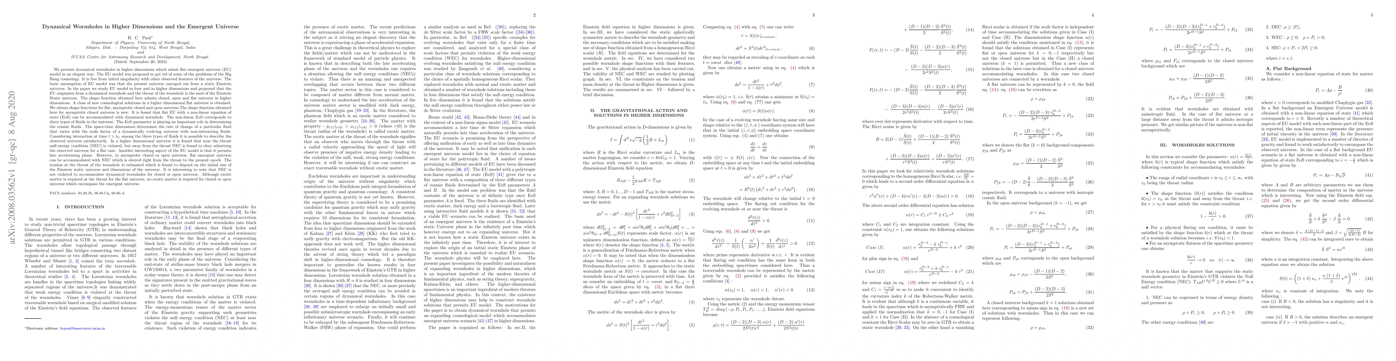 Dynamical wormholes in higher dimensions which admit flat emergent universe (EU) model is presented. The EU model is free from initial singularity with other observed features of the universe. The basic assumption of EU model was that the present universe emerged out from a static Einstein universe. EU model originates from a dynamical wormhole, its throat is the seed of Einstein Static universe. A class of cosmological solutions in a higher dimensional flat universe is presented. A new shape function for closed universe is determined. The non-linear equation of state (EoS) corresponds to three types of cosmic fluids. The EoS parameters determine the cosmic fluids. The space-time dimensions determines the rate of change of a particular fluid that varies with the scale factor of a dynamically evolving universe with non-interacting fluids. Considering interaction at time $t > t_0$, among the three types of fluids it is possible to describe the observed universe satisfactorily. In a higher dimensional universe it is found that near the throat null energy condition (NEC) is violated, but away from the throat NEC is found to obey admitting the observed universe for a flat case. Another interesting aspect of the EU model is that it permits late accelerating phase. However, in asymptotic closed or open universe, flat emergent universe can be accommodated with NEC which is obeyed right from the throat to the present epoch. The tension at the throat of the wormhole is estimated which is found to depend on the initial size of the Einstein static universe and dimensions of the universe. It is interesting to note that NEC is not violated to accommodate dynamical wormholes for closed or open universe. Although exotic matter is required at the throat for the flat universe, no exotic matter is required for closed or open universe which encompass the emergent universe.