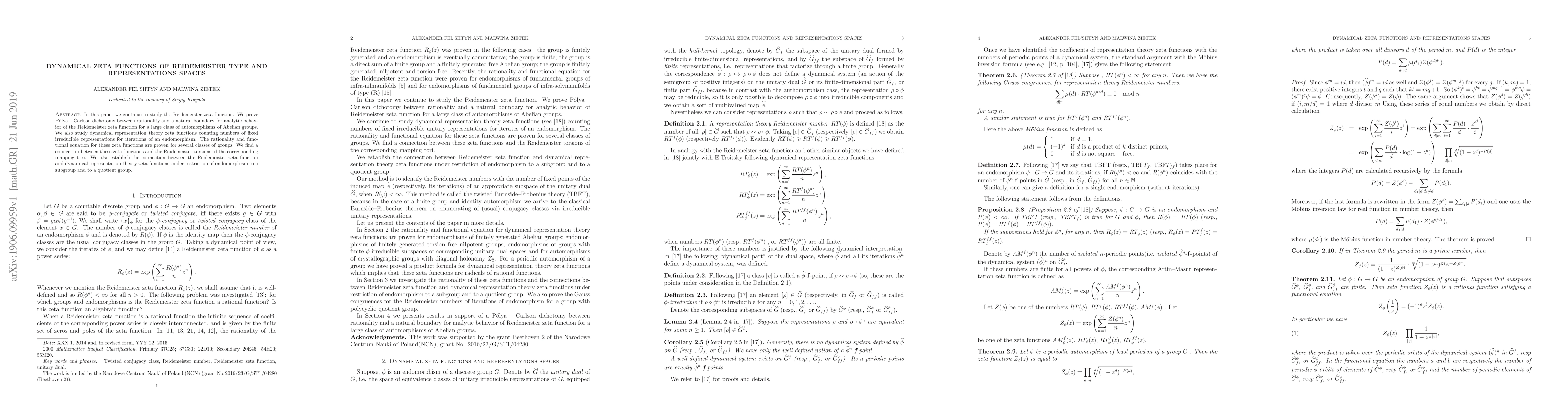 This paper investigates the Reidemeister zeta function, proving a Pólya-Carlson dichotomy regarding its rationality or natural boundary for automorphisms of Abelian groups. It also explores dynamical representation theory zeta functions, establishing their rationality and functional equations for various group classes and connecting them to Reidemeister torsions and mapping tori.