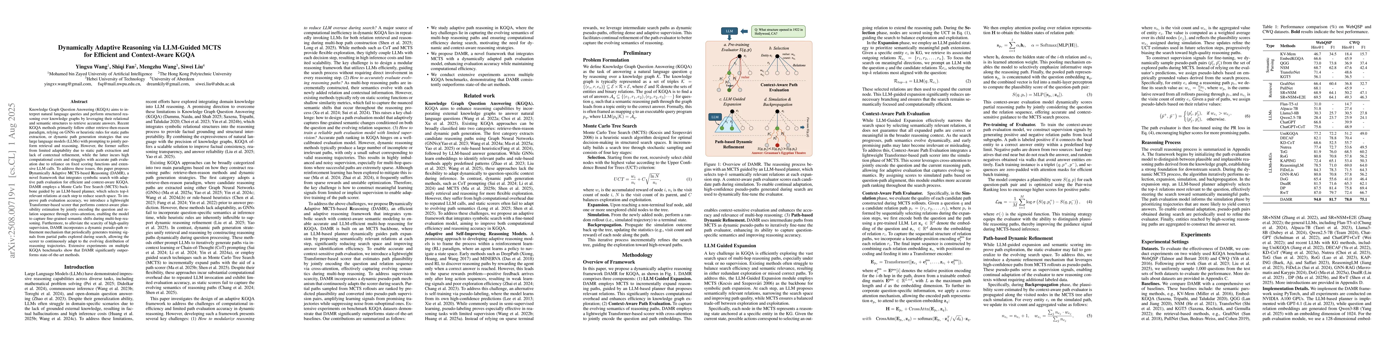 This paper proposes Dynamically Adaptive MCTS-based Reasoning (DAMR), a framework that integrates symbolic search with adaptive path evaluation for efficient and context-aware KGQA. DAMR uses Monte Carlo Tree Search (MCTS) guided by a language model-based planner, a lightweight Transformer-based scorer, and a dynamic pseudo-path refinement mechanism.
