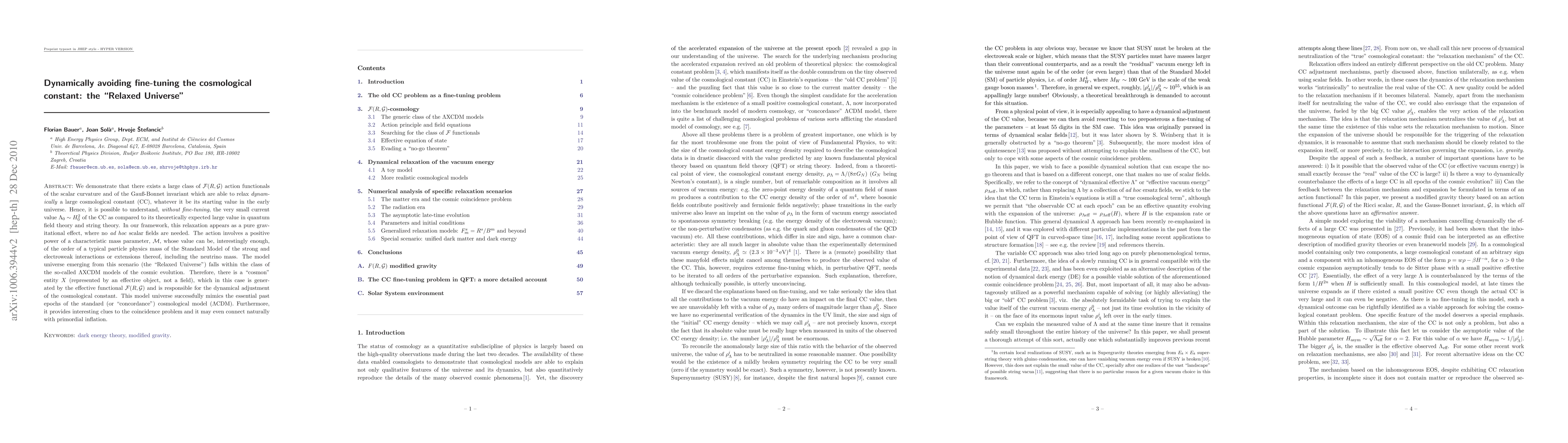 This paper proposes a new cosmological model, the "Relaxed Universe," where a class of action functionals dynamically adjusts the cosmological constant without fine-tuning, explaining the small observed value without ad hoc scalar fields. The model involves a "cosmon" entity responsible for the cosmological constant's relaxation, mimicking the standard cosmological model's evolution and offering insights into the coincidence problem and primordial inflation.