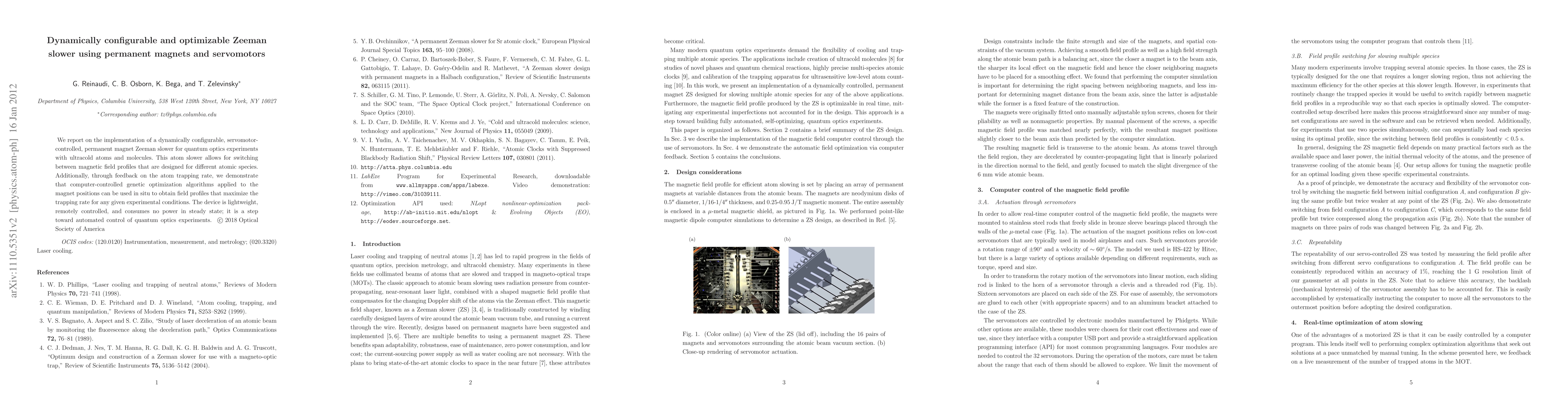 Researchers developed a dynamically configurable Zeeman slower using permanent magnets and servomotors for quantum optics experiments, optimizing trapping rates with computer-controlled genetic algorithms.