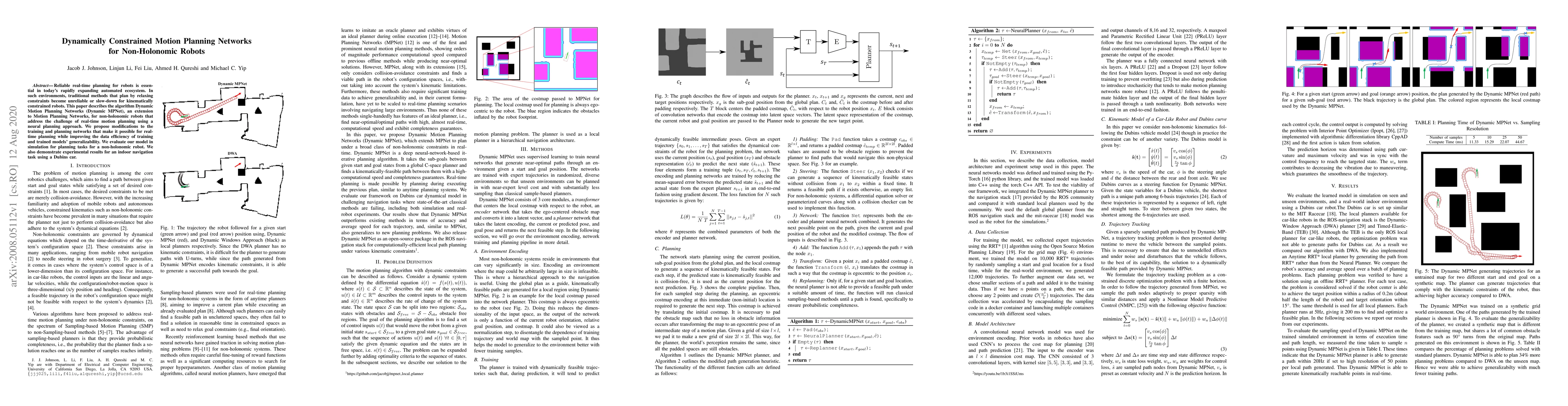 This paper introduces Dynamic Motion Planning Networks (Dynamic MPNet), a neural planning approach for real-time motion planning of non-holonomic robots, addressing the limitations of traditional methods. The proposed modifications enhance training efficiency and model generalizability, demonstrated through simulation and an indoor navigation task using a Dubins car.