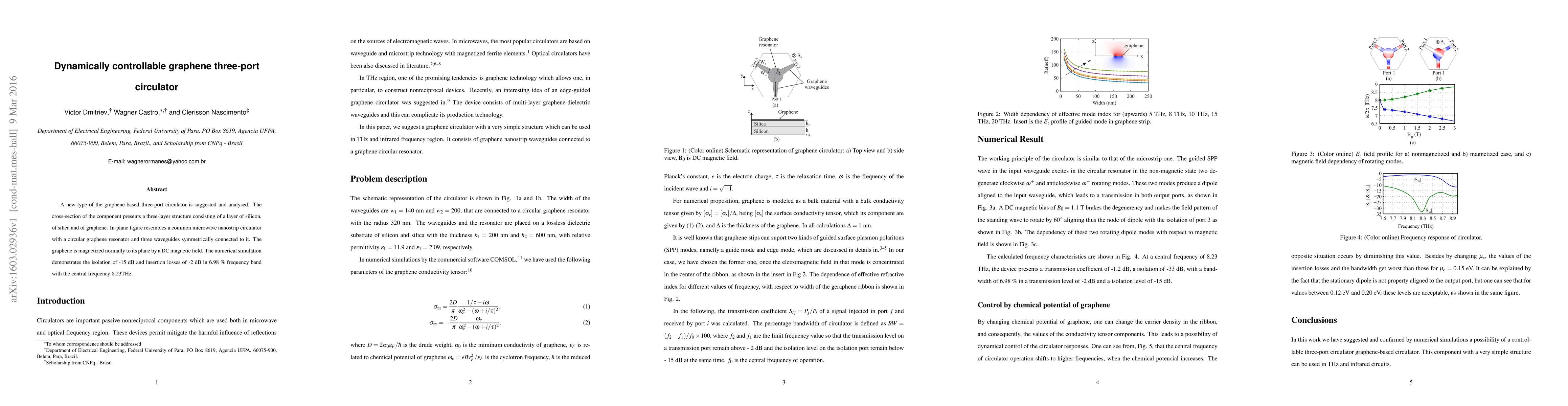 A graphene-based three-port circulator with a three-layer structure of silicon, silica, and graphene is proposed, featuring a magnetized graphene resonator. Numerical simulations show an isolation of -15 dB and insertion losses of -2 dB within a 6.98% frequency band centered at 8.23 THz.