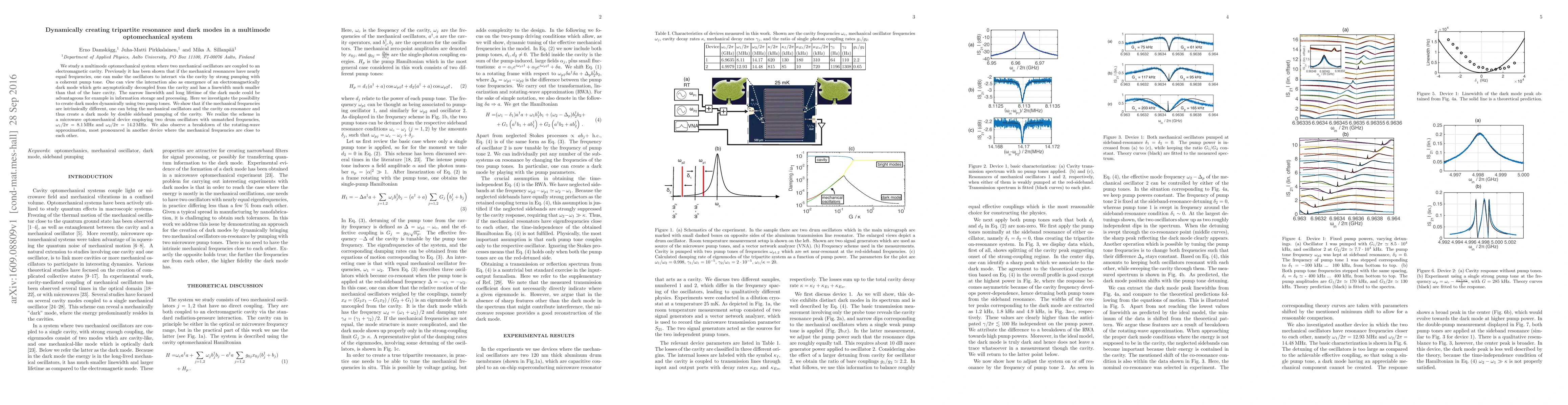 This paper explores dynamically creating tripartite resonance and dark modes in a multimode optomechanical system using two pump tones. It demonstrates the generation of a dark mode in a microwave optomechanical device with two mismatched drum oscillators, highlighting the breakdown of the rotating-wave approximation when mechanical frequencies are close.