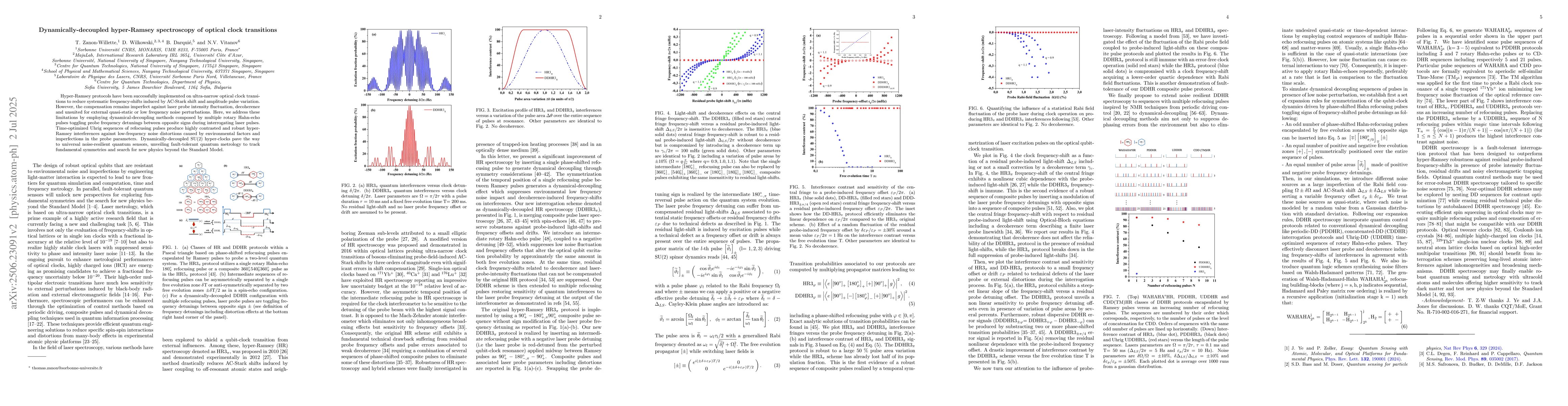 The research employs dynamically-decoupled hyper-Ramsey spectroscopy on ultra-narrow optical clock transitions to mitigate systematic frequency shifts caused by AC-Stark shift, probe intensity fluctuation, decoherence, and low-frequency noise perturbations.