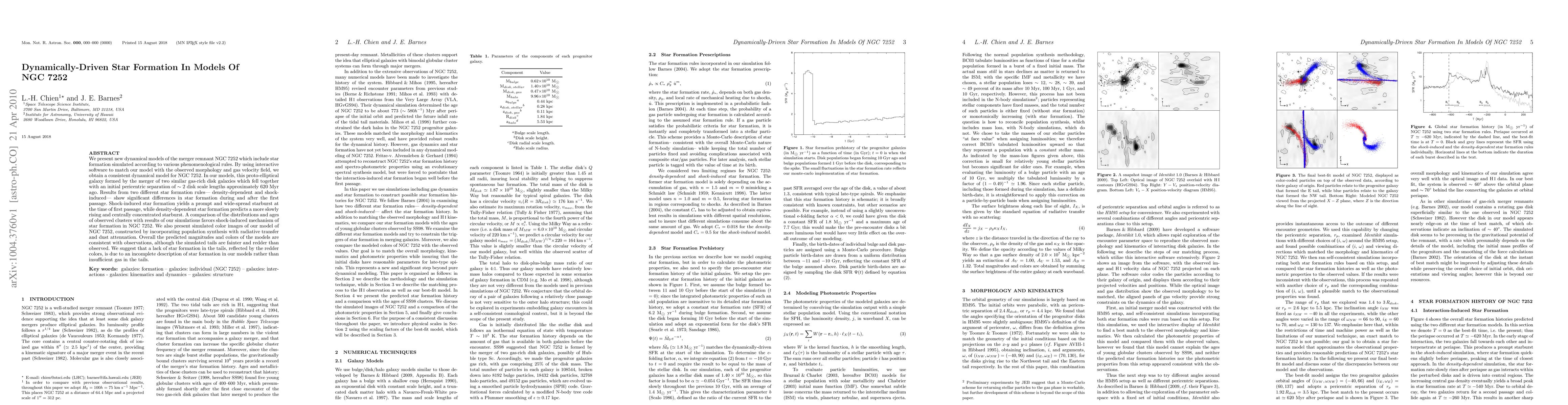 This paper presents dynamical models of NGC 7252, a merger remnant galaxy, incorporating star formation rules to match observed morphology and gas velocity. The study finds that shock-induced star formation better explains the observed starbursts compared to density-dependent star formation, suggesting a more prompt and widespread starburst during the merger.