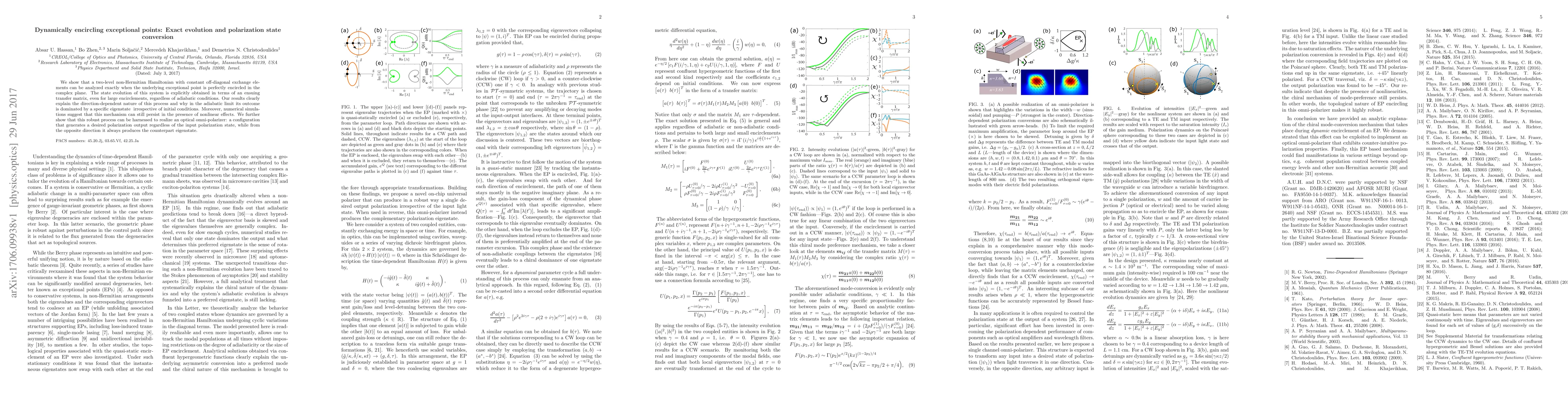 The paper presents an exact analytical solution for the state evolution around an EP, applicable for large encirclements, and demonstrates its potential for creating an optical omni-polarizer.