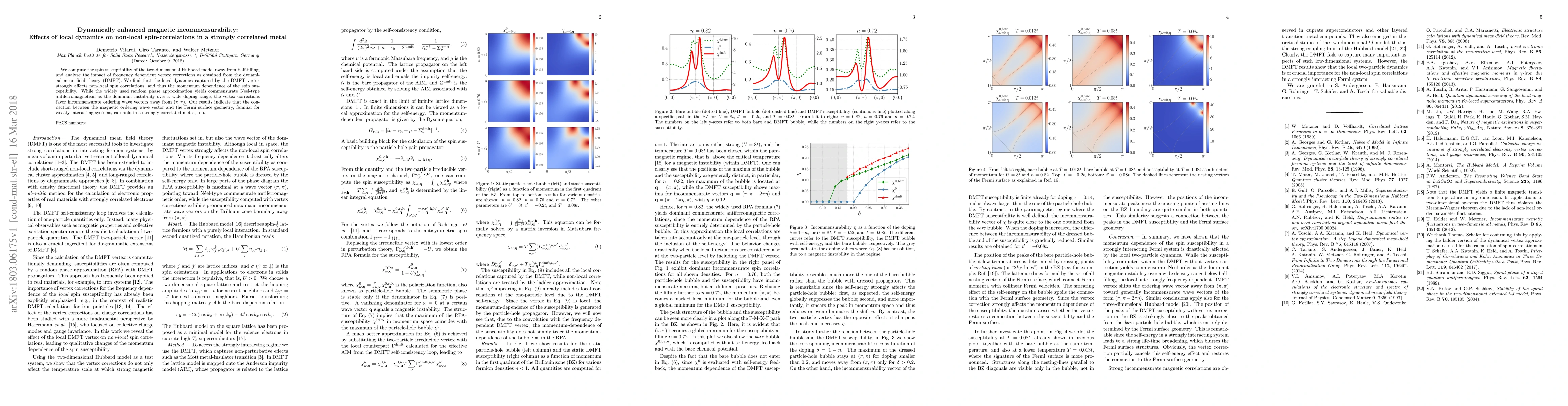 We compute the spin susceptibility of the two-dimensional Hubbard model away from half-filling, and analyze the impact of frequency dependent vertex corrections as obtained from the dynamical mean field theory (DMFT). We find that the local dynamics captured by the DMFT vertex strongly affects non-local spin correlations, and thus the momentum dependence of the spin susceptibility. While the widely used random phase approximation yields commensurate N\'eel-type antiferromagnetism as the dominant instability over a wide doping range, the vertex corrections favor incommensurate ordering wave vectors away from $(\pi,\pi)$. Our results indicate that the connection between the magnetic ordering wave vector and the Fermi surface geometry, familiar for weakly interacting systems, can hold in a strongly correlated metal, too.