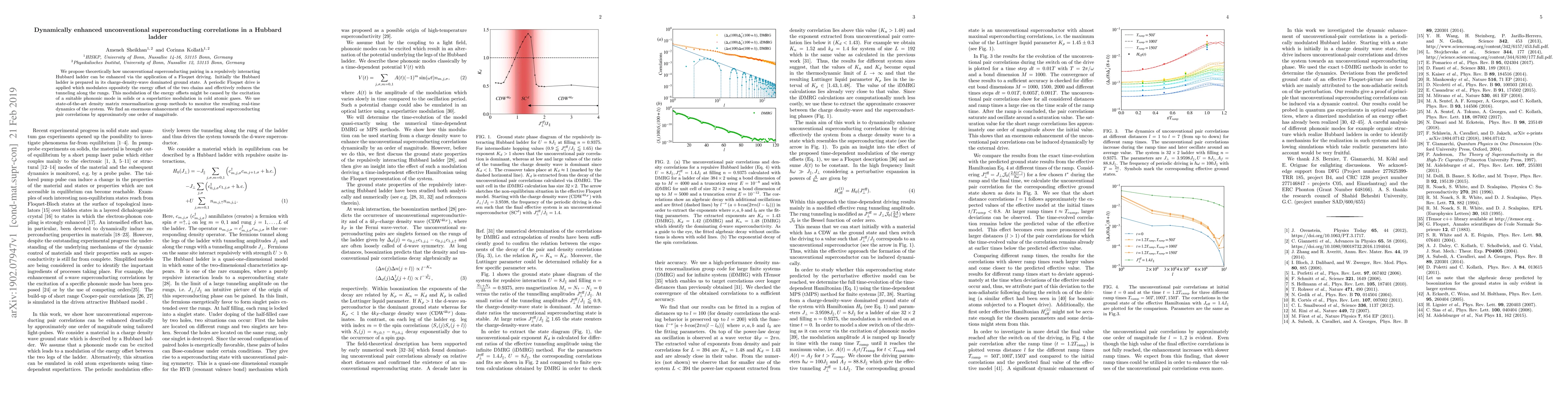 We propose theoretically how unconventional superconducting pairing in a repulsively interacting Hubbard ladder can be enhanced via the application of a Floquet driving. Initially the Hubbard ladder is prepared in its charge-density-wave dominated ground state. A periodic Floquet drive is applied which modulates oppositely the energy offset of the two chains and effectively reduces the tunneling along the rungs. This modulation of the energy offsets might be caused by the excitation of a suitable phononic mode in solids or a superlattice modulation in cold atomic gases. We use state-of-the-art density matrix renormalization group methods to monitor the resulting real-time dynamics of the system. We find an enormous enhancement of the unconventional superconducting pair correlations by approximately one order of magnitude.