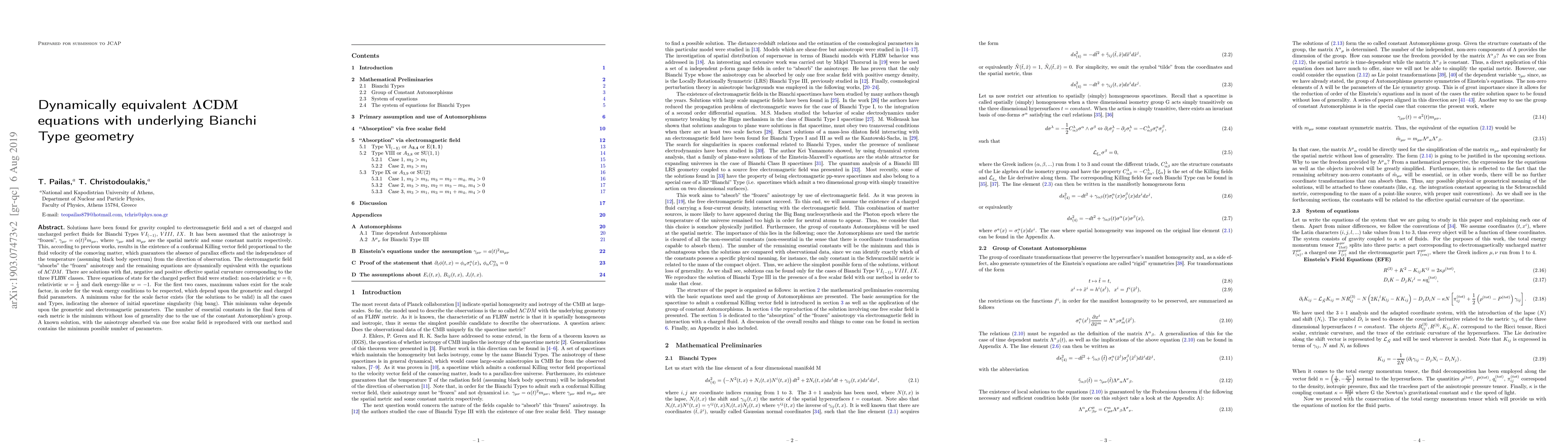 Solutions have been found for gravity coupled to electromagnetic field and a set of charged and uncharged perfect fluids for Bianchi Types VI_{(-1)}, VIII, IX, under the primary assumption of the existence of a conformal Killing vector field. The electromagnetic field ``absorbs'' the ``frozen'' anisotropy and the remaining equations are dynamically equivalent with the equations of {\Lambda}CDM. There are solutions with flat, negative and positive effective spatial curvature corresponding to the three FLRW classes. Three equations of state for the charged perfect fluid where studied: non-relativistic w=0, relativistic w=\frac{1}{3} and dark energy-like w=-1. For the first two cases, maximum values exist for the scale factor, in order for the weak energy conditions to be respected, which depend upon the geometric and charged fluid parameters. A minimum value for the scale factor exists (for the solutions to be valid) in all the cases and Types, indicating the absence of initial spacetime singularity (big bang). This minimum value depends upon the geometric and electromagnetic parameters. The number of essential constants in the final form of each metric is the minimum without loss of generality due to the use of the constant Automorphism's group. A known solution, with the anisotropy absorbed via one free scalar field is reproduced with our method and contains the minimum possible number of parameters.