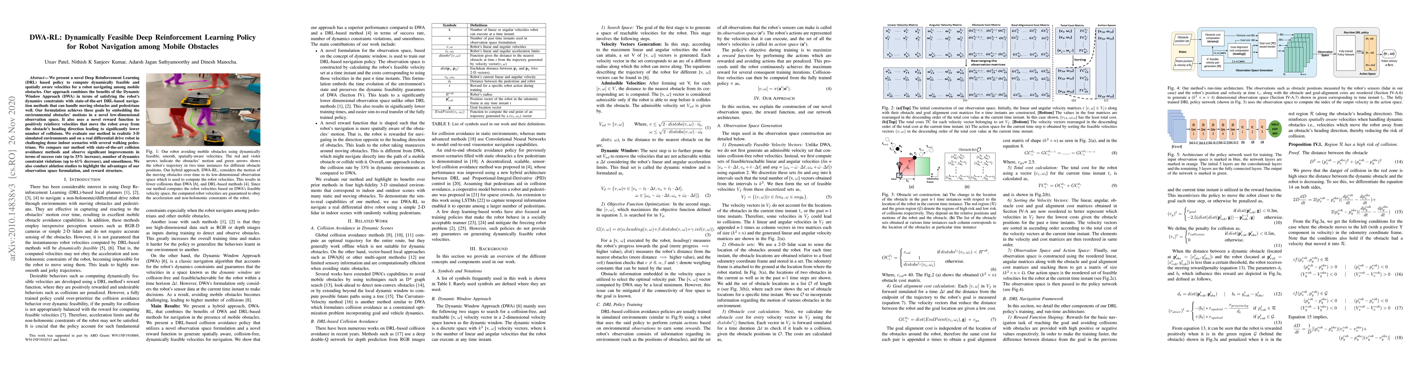 We present a novel Deep Reinforcement Learning (DRL) based policy to compute dynamically feasible and spatially aware velocities for a robot navigating among mobile obstacles. Our approach combines the benefits of the Dynamic Window Approach (DWA) in terms of satisfying the robot's dynamics constraints with state-of-the-art DRL-based navigation methods that can handle moving obstacles and pedestrians well. Our formulation achieves these goals by embedding the environmental obstacles' motions in a novel low-dimensional observation space. It also uses a novel reward function to positively reinforce velocities that move the robot away from the obstacle's heading direction leading to significantly lower number of collisions. We evaluate our method in realistic 3-D simulated environments and on a real differential drive robot in challenging dense indoor scenarios with several walking pedestrians. We compare our method with state-of-the-art collision avoidance methods and observe significant improvements in terms of success rate (up to 33\% increase), number of dynamics constraint violations (up to 61\% decrease), and smoothness. We also conduct ablation studies to highlight the advantages of our observation space formulation, and reward structure.