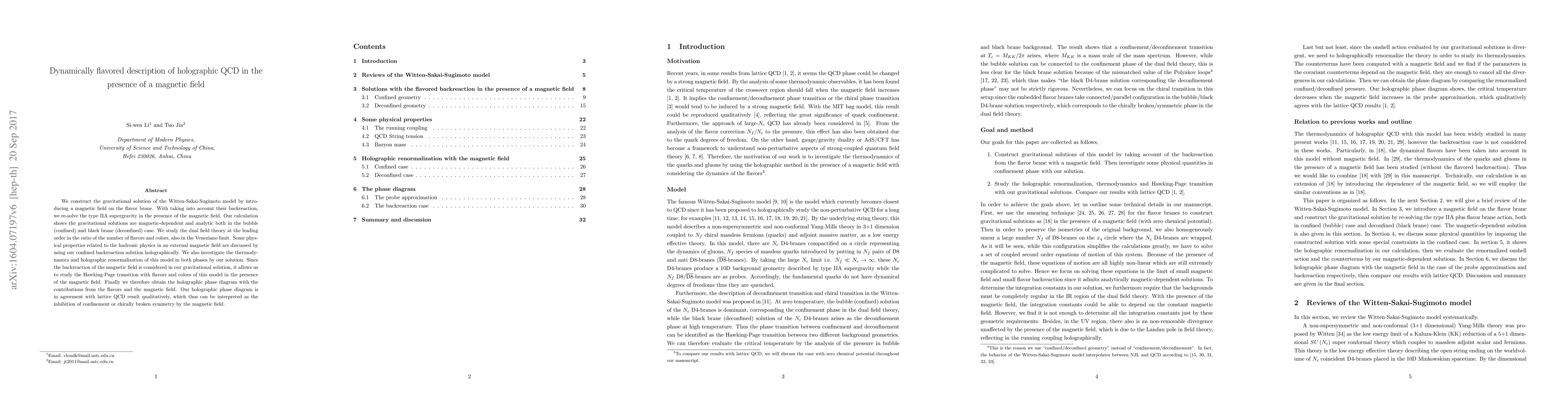 We construct the gravitational solution of the Witten-Sakai-Sugimoto model by introducing a magnetic field on the flavor brane. With taking into account their backreaction, we re-solve the type IIA supergravity in the presence of the magnetic field. Our calculation shows the gravitational solutions are magnetic-dependent and analytic both in the bubble (confined) and black brane (deconfined) case. We study the dual field theory at the leading order in the ratio of the number of flavors and colors, also in the Veneziano limit. Some physical properties related to the hadronic physics in an external magnetic field are discussed by using our confined backreaction solution holographically. We also investigate the thermodynamics and holographic renormalization of this model in both phases by our solution. Since the backreaction of the magnetic field is considered in our gravitational solution, it allows us to study the Hawking-Page transition with flavors and colors of this model in the presence of the magnetic field. Finally we therefore obtain the holographic phase diagram with the contributions from the flavors and the magnetic field. Our holographic phase diagram is in agreement with lattice QCD result qualitatively, which thus can be interpreted as the inhibition of confinement or chirally broken symmetry by the magnetic field.