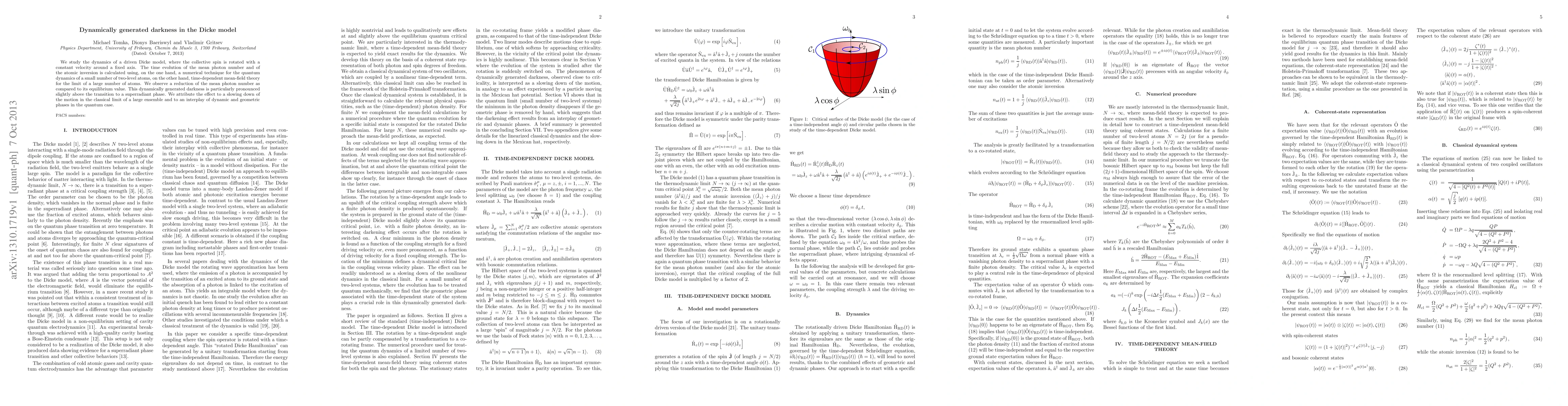 The research investigates the dynamics of a driven Dicke model, showing a reduction in mean photon number, termed dynamically generated darkness, particularly near the superradiant transition. This effect is explained by the interplay of dynamic and geometric phases in quantum cases and slowing motion in large ensembles.