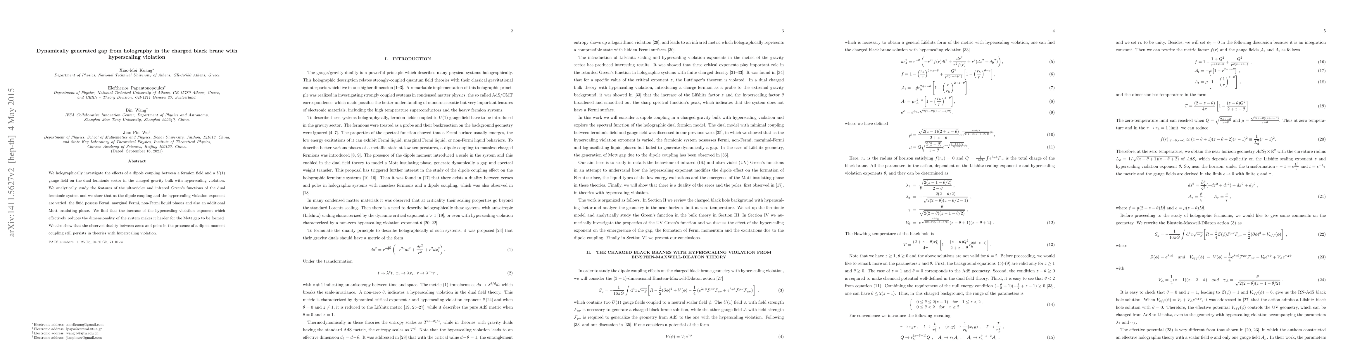 We holographically investigate the effects of a dipole coupling between a fermion field and a $U(1)$ gauge field on the dual fermionic sector in the charged gravity bulk with hyperscaling violation. We analytically study the features of the ultraviolet and infrared Green's functions of the dual fermionic system and we show that as the dipole coupling and the hyperscaling violation exponent are varied, the fluid possess Fermi, marginal Fermi, non-Fermi liquid phases and also an additional Mott insulating phase. We find that the increase of the hyperscaling violation exponent which effectively reduces the dimensionality of the system makes it harder for the Mott gap to be formed. We also show that the observed duality between zeros and poles in the presence of a dipole moment coupling still persists in theories with hyperscaling violation.