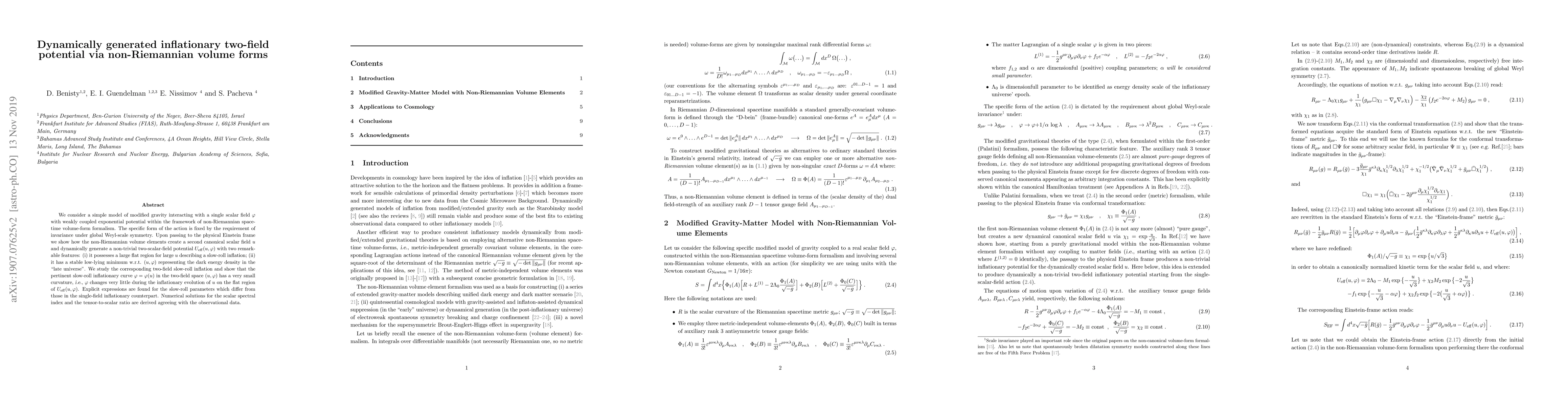 We consider a simple model of modified gravity interacting with a single scalar field $\varphi$ with weakly coupled exponential potential within the framework of non-Riemannian spacetime volume-form formalism. The specific form of the action is fixed by the requirement of invariance under global Weyl-scale symmetry. Upon passing to the physical Einstein frame we show how the non-Riemannian volume elements create a second canonical scalar field $u$ and dynamically generate a non-trivial two-scalar-field potential $U_{\rm eff}(u,\varphi)$ with two remarkable features: (i) it possesses a large flat region for large $u$ describing a slow-roll inflation; (ii) it has a stable low-lying minimum w.r.t. $(u,\varphi)$ representing the dark energy density in the "late universe". We study the corresponding two-field slow-roll inflation and show that the pertinent slow-roll inflationary curve $\varphi = \varphi(u)$ in the two-field space $(u,\varphi)$ has a very small curvature, i.e., $\varphi$ changes very little during the inflationary evolution of $u$ on the flat region of $U_{\rm eff}(u,\varphi)$. Explicit expressions are found for the slow-roll parameters which differ from those in the single-field inflationary counterpart. Numerical solutions for the scalar spectral index and the tensor-to-scalar ratio are derived agreeing with the observational data.