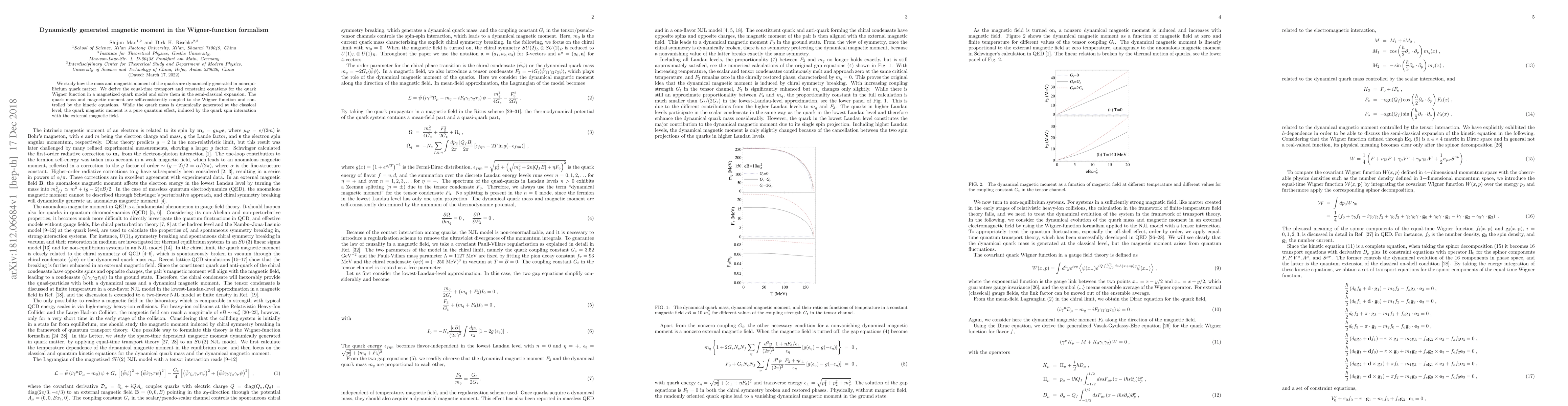 We study how the mass and magnetic moment of the quarks are dynamically generated in nonequilibrium quark matter. We derive the equal-time transport and constraint equations for the quark Wigner function in a magnetized quark model and solve them in the semi-classical expansion. The quark mass and magnetic moment are self-consistently coupled to the Wigner function and controlled by the kinetic equations. While the quark mass is dynamically generated at the classical level, the quark magnetic moment is a pure quantum effect, induced by the quark spin interaction with the external magnetic field.
