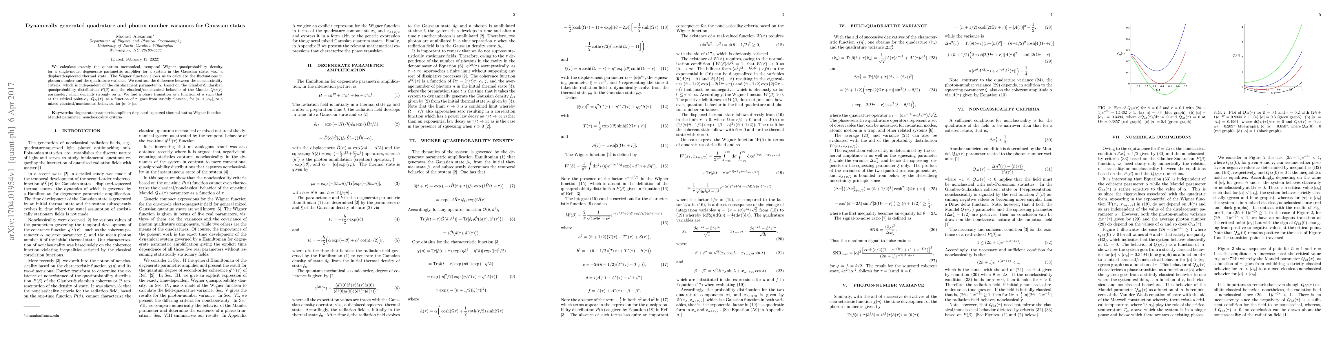 We calculate exactly the quantum mechanical, temporal Wigner quasiprobability density for a single-mode, degenerate parametric amplifier for a system in the Gaussian state, viz., a displaced-squeezed thermal state. The Wigner function allows us to calculate the fluctuations in photon number and the quadrature variance. We contrast the difference between the nonclassicality criteria, which is independent of the displacement parameter $\alpha$, based on the Glauber-Sudarshan quasiprobability distribution $P(\beta)$ and the classical/nonclassical behavior of the Mandel $Q_{M}(\tau)$ parameter, which depends strongly on $\alpha$. We find a phase transition as a function of $\alpha$ such that at the critical point $\alpha_{c}$, $Q_{M}(\tau)$, as a function of $\tau$, goes from strictly classical, for $|\alpha|< |\alpha_{c}|$, to a mixed classical/nonclassical behavior, for $|\alpha|> |\alpha_{c}|$.
