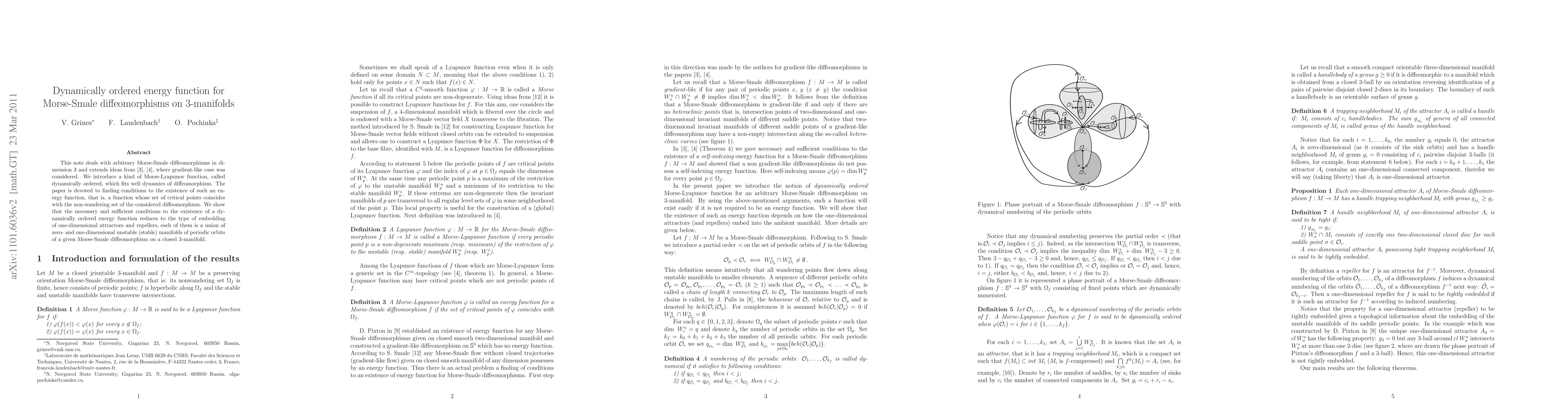 This paper explores Morse-Smale diffeomorphisms in 3-dimensional manifolds and introduces a dynamically ordered energy function. It establishes necessary and sufficient conditions for the existence of such a function, linking it to the embedding types of attractors and repellers.