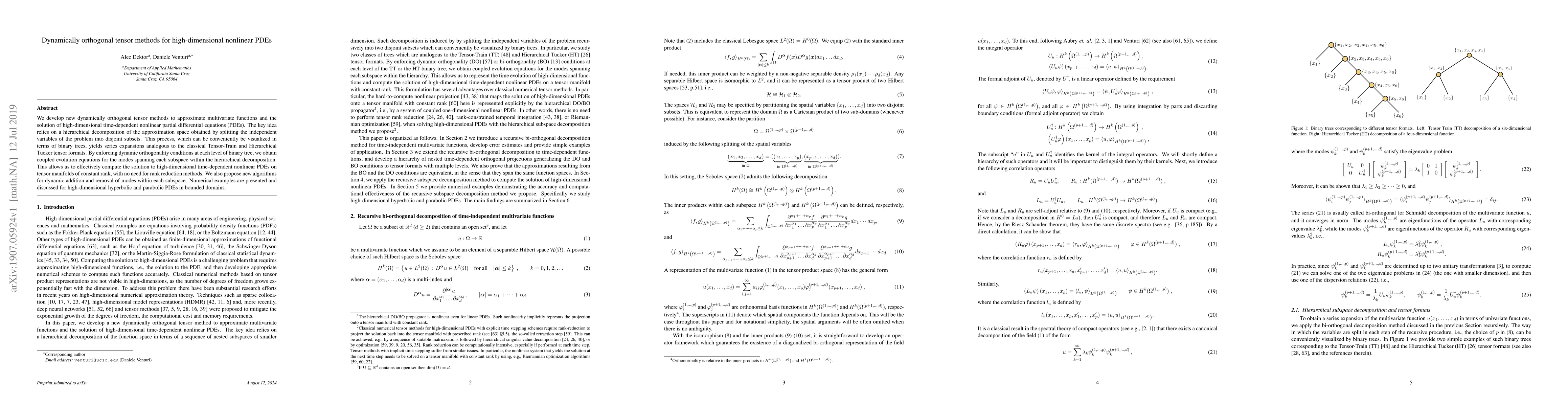 This paper introduces dynamically orthogonal tensor methods for solving high-dimensional nonlinear PDEs, leveraging hierarchical decomposition and binary tree visualization to maintain constant rank solutions without rank reduction. The proposed algorithms enable dynamic addition and removal of modes, demonstrated through numerical examples of hyperbolic and parabolic PDEs.