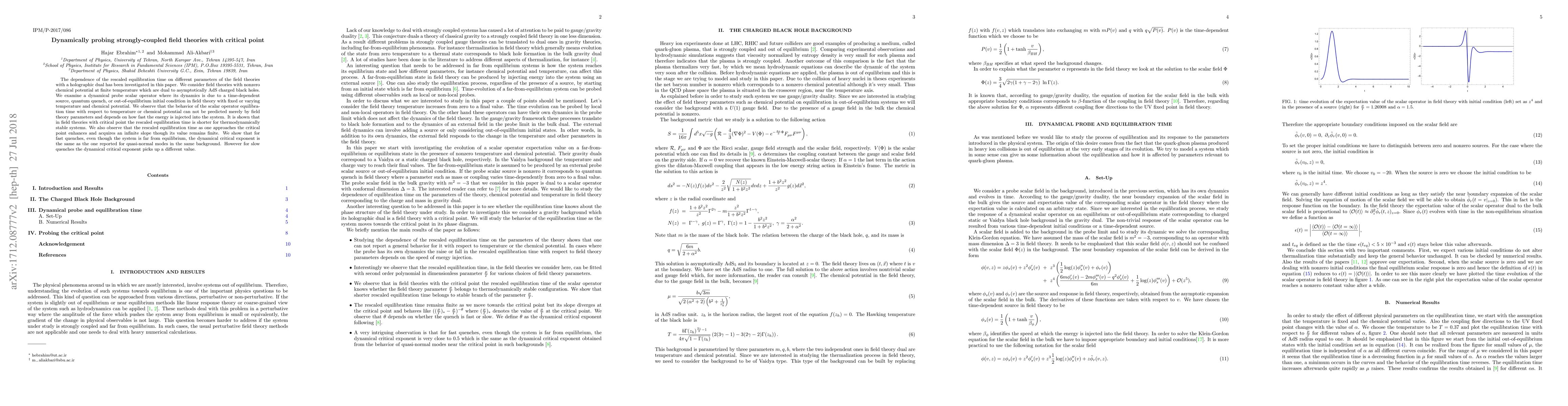 The dependence of the rescaled equilibration time on different parameters of the field theories with a holographic dual has been investigated in this paper. We consider field theories with nonzero chemical potential at finite temperature which are dual to asymptotically AdS charged black holes. We examine a dynamical probe scalar operator where its dynamics is due to a time-dependent source, quantum quench, or out-of-equilibrium initial condition in field theory with fixed or varying temperature and chemical potential. We observe that the behavior of the scalar operator equilibration time with respect to temperature or chemical potential can not be predicted merely by field theory parameters and depends on how fast the energy is injected into the system. It is shown that in field theories with critical point the rescaled equilibration time is shorter for thermodynamically stable systems. We also observe that the rescaled equilibration time as one approaches the critical point enhances and acquires an infinite slope though its value remains finite. We show that for fast quenches, even though the system is far from equilibrium, the dynamical critical exponent is the same as the one reported for quasi-normal modes in the same background. However for slow quenches the dynamical critical exponent picks up a different value.