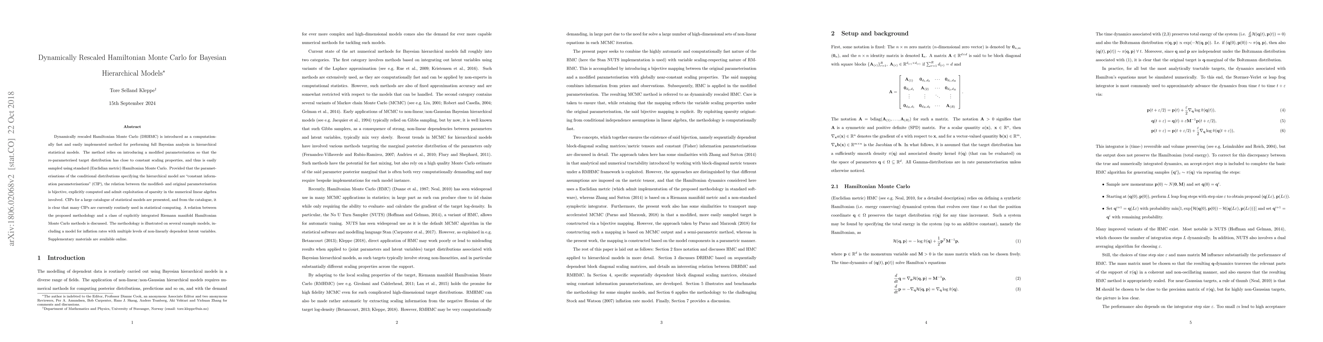 Dynamically rescaled Hamiltonian Monte Carlo (DRHMC) is a fast, easily implemented method for Bayesian analysis in hierarchical models, enabling efficient sampling via standard Hamiltonian Monte Carlo through modified parameterisations. The approach leverages "constant information parameterisations" (CIP) to exploit sparsity and is illustrated on various statistical models.