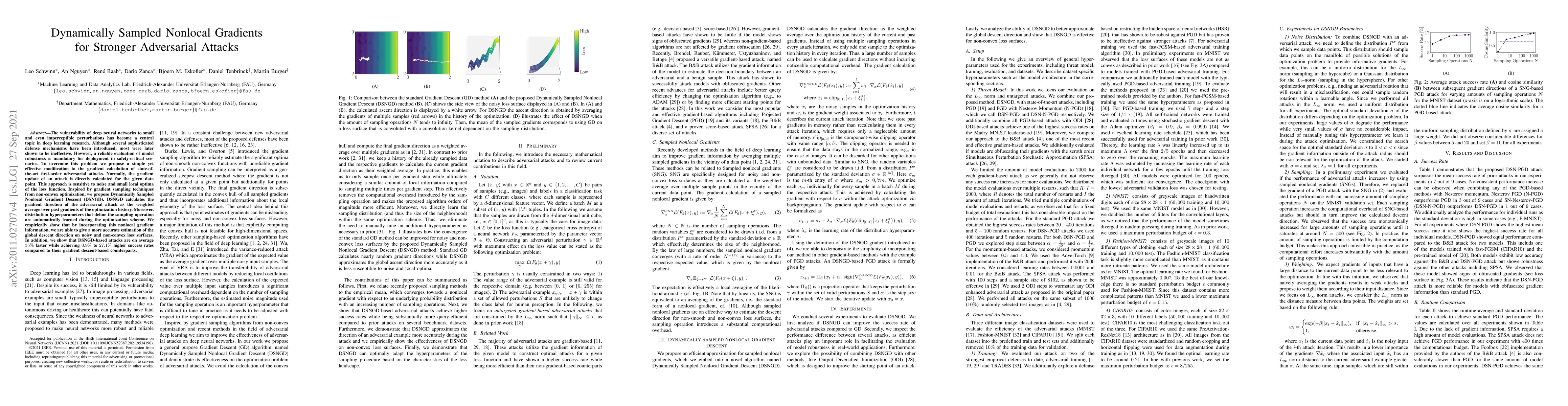 The vulnerability of deep neural networks to small and even imperceptible perturbations has become a central topic in deep learning research. Although several sophisticated defense mechanisms have been introduced, most were later shown to be ineffective. However, a reliable evaluation of model robustness is mandatory for deployment in safety-critical scenarios. To overcome this problem we propose a simple yet effective modification to the gradient calculation of state-of-the-art first-order adversarial attacks. Normally, the gradient update of an attack is directly calculated for the given data point. This approach is sensitive to noise and small local optima of the loss function. Inspired by gradient sampling techniques from non-convex optimization, we propose Dynamically Sampled Nonlocal Gradient Descent (DSNGD). DSNGD calculates the gradient direction of the adversarial attack as the weighted average over past gradients of the optimization history. Moreover, distribution hyperparameters that define the sampling operation are automatically learned during the optimization scheme. We empirically show that by incorporating this nonlocal gradient information, we are able to give a more accurate estimation of the global descent direction on noisy and non-convex loss surfaces. In addition, we show that DSNGD-based attacks are on average 35% faster while achieving 0.9% to 27.1% higher success rates compared to their gradient descent-based counterparts.