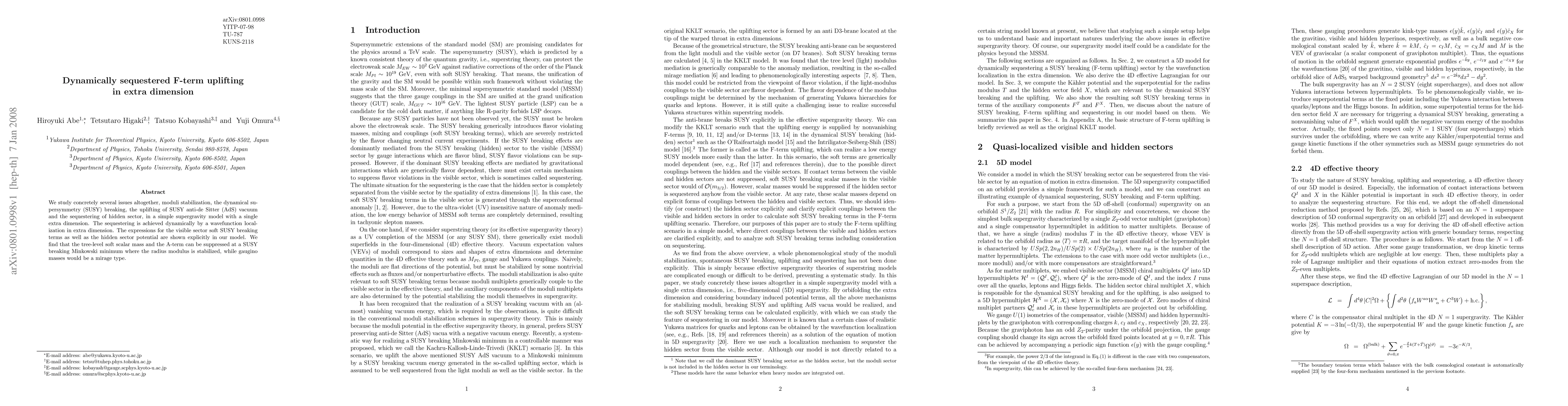This paper explores moduli stabilization, dynamical SUSY breaking, uplifting of SUSY AdS vacuum, and hidden sector sequestering in a supergravity model with an extra dimension, where sequestering is dynamically achieved via wavefunction localization. The model explicitly demonstrates suppressed tree-level soft scalar masses and A-terms at a SUSY breaking Minkowski minimum, while gaugino masses appear as mirages.